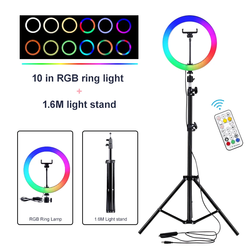 LED 10 inch RGB Dimmable Ring Lamp with Phone Clip Remote Control Photography Colorful Lighting for YouTube Live Stream