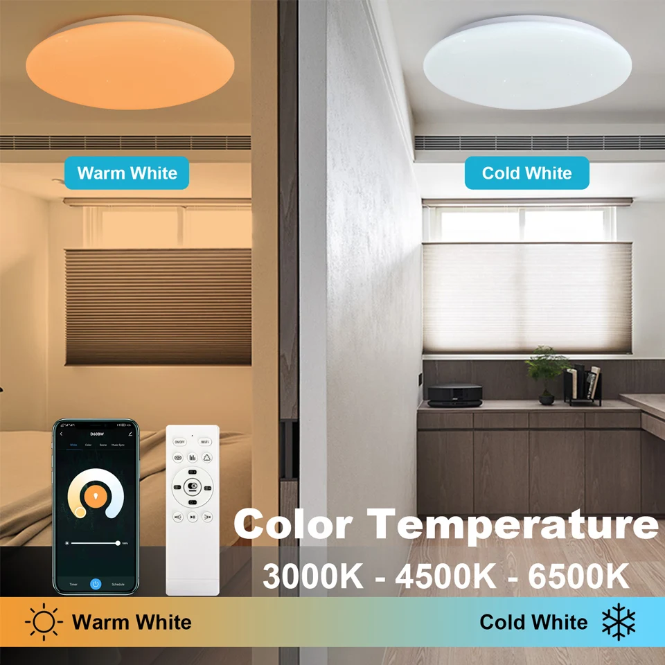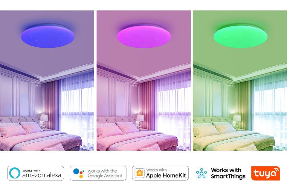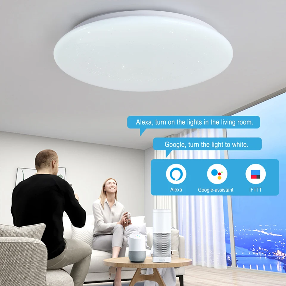 With "Amazon Alexa" and "Hey Google" connected, you can control your smart ceiling light by voice.You can turn the light on and off, adjust the brightness, and even choose the background color of the light you want.