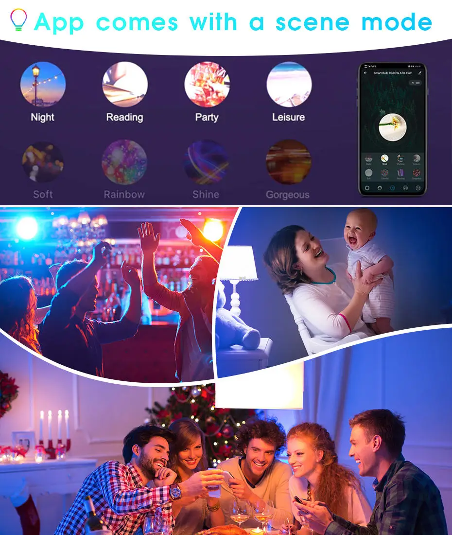 You can set different light modes on smart life to match various occasions including kitchen, living room, bedroom.peteme smart bulb also can be used for table lamp, cafe, bar, party, etc.and have this functions Color Palette, Group Control, Sunlight, Timer, Sunrise, Sunset, Dimmable, MIC Function, DIY mode, Scene mode, Energy Saving......