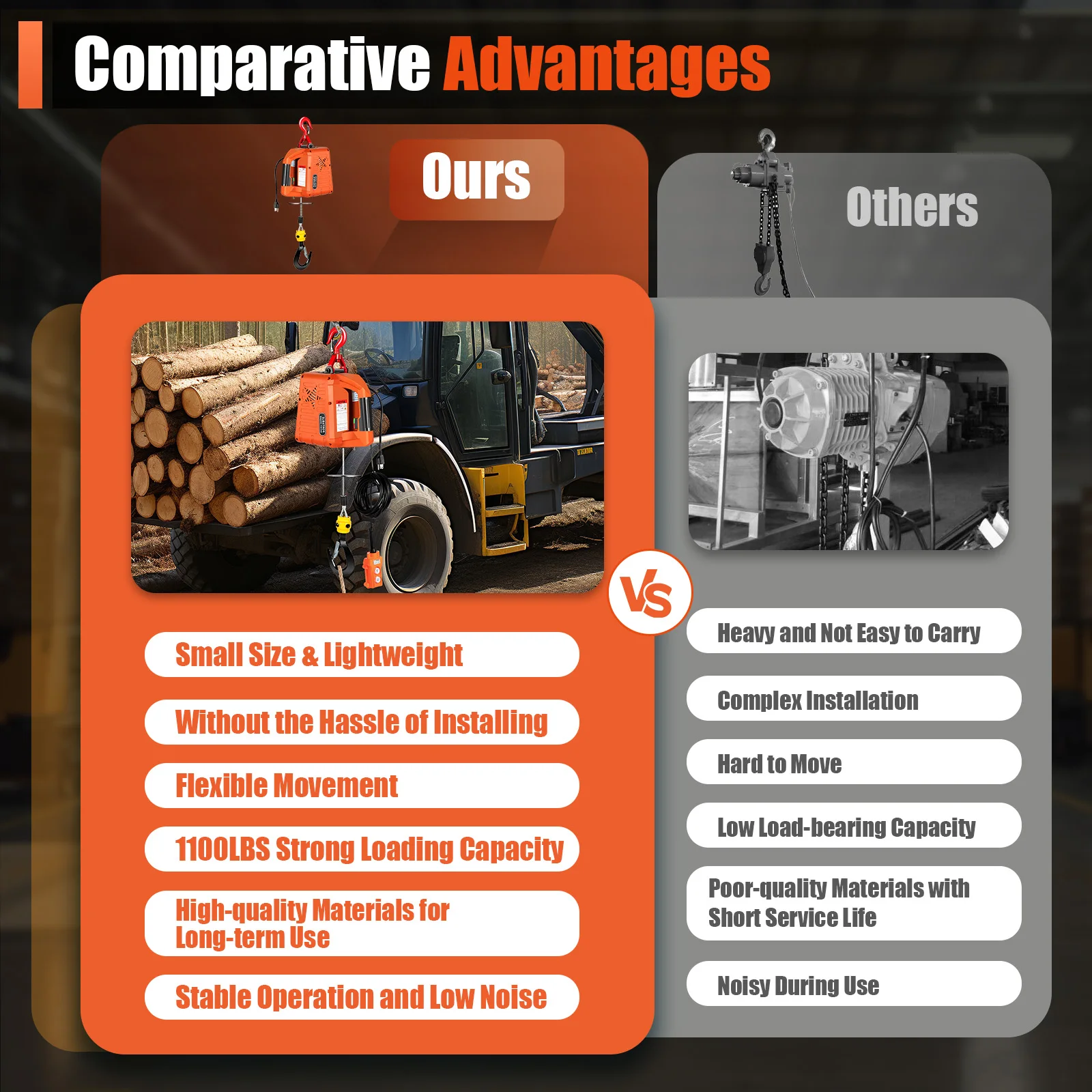 Hassle-free Installation: Compared to traditional electric hoists, this electric hoist does not require professional tools for installation and can be hung to use immediately, making your lifting work easier.