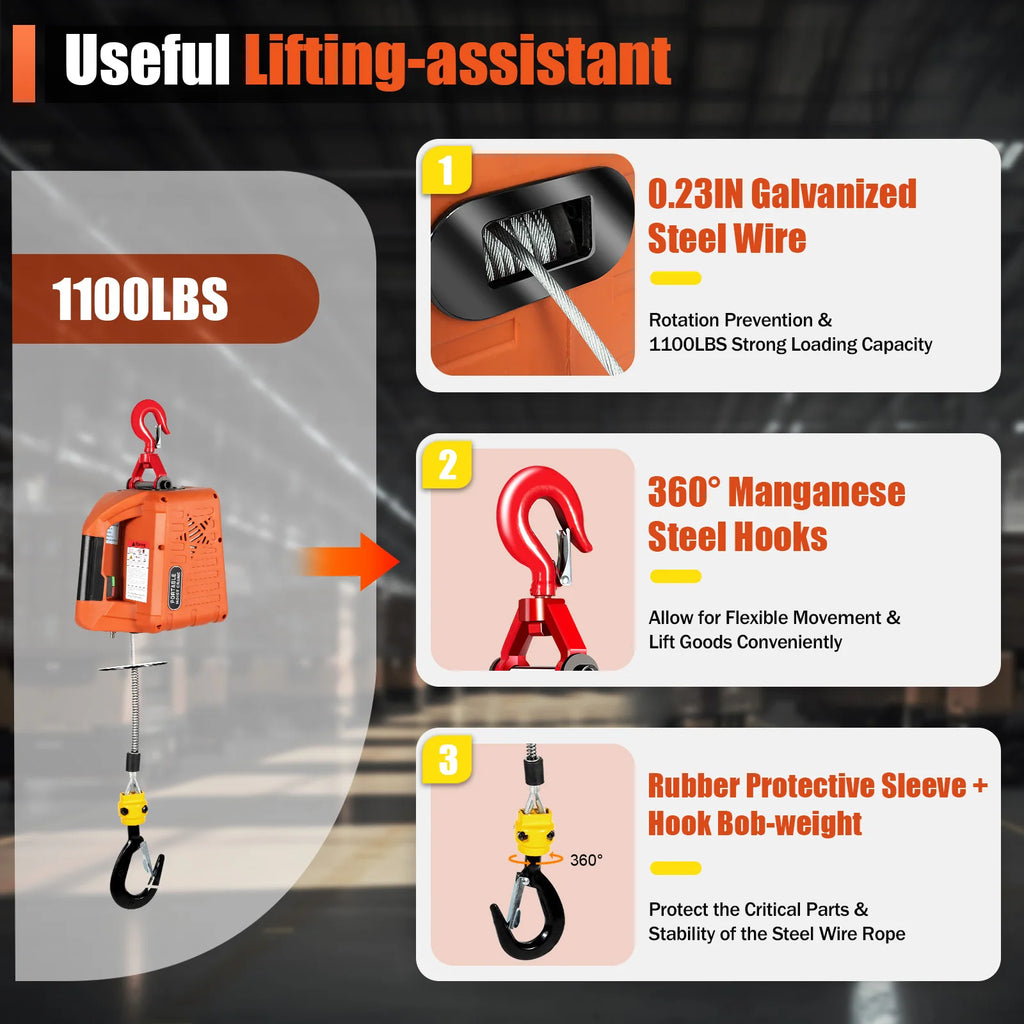 This 3-in-1 electric hoist winch is a practical tool that can easily lift a weight of 1100lbs, helping you easily tackle various challenges at work. It has a wide range of application prospects in fields such as homes, factories, warehouses, and construction, greatly improving the efficiency of lifting work. In addition, it also adopts multiple user-friendly designs, such as a portable handle, a 360° rotatable hook, and a thick steel wire rope, making its use more convenient and flexible. In short, this electric hoist winch is your reliable choice.