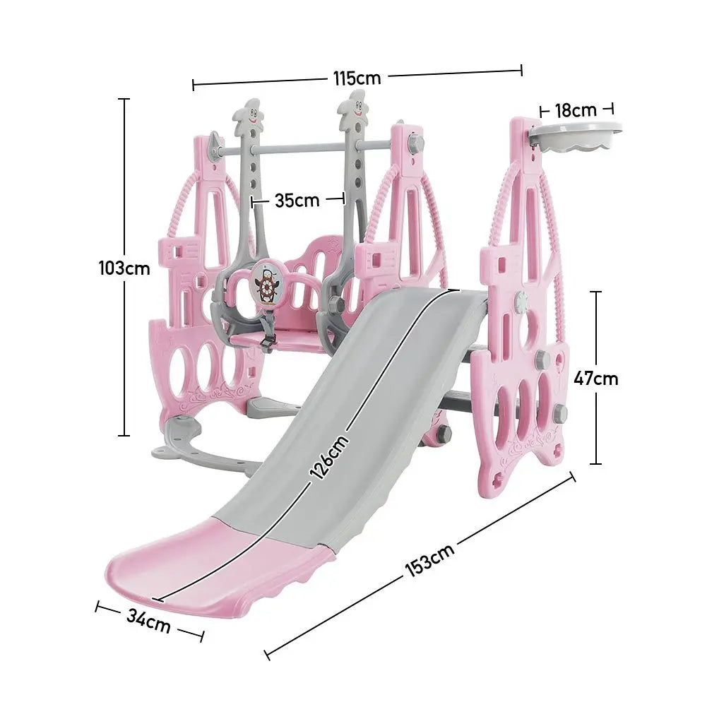 *3-in-1 design: a smooth slide, a sturdy swing, a basketball hoop.