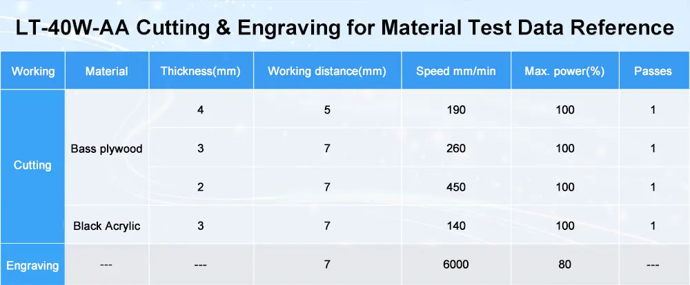 For engraving, the focal point is at the surface of the material, the focal length of LT-40W-AA is 45mm, the length of the air nozzle is 38mm, so the focal point position is 7mm(45-38mm) below the air nozzle.
