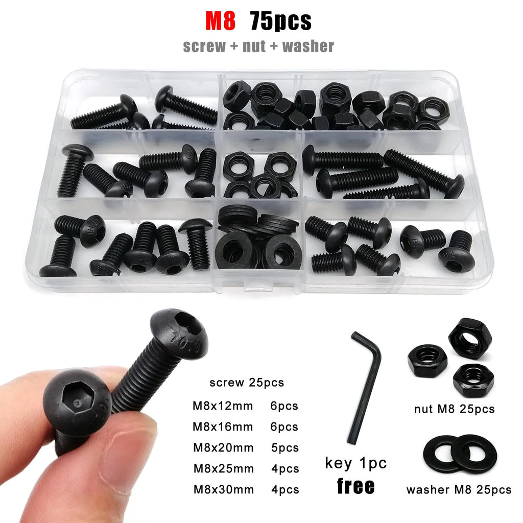 M1.6 M2 M2.5 M3 M4 M5 M6 M8 Black Grade 10.9 Steel Allen Hexagon Hex Socket Button Round Head Screw Bolt Nut Washer Kit Set Box