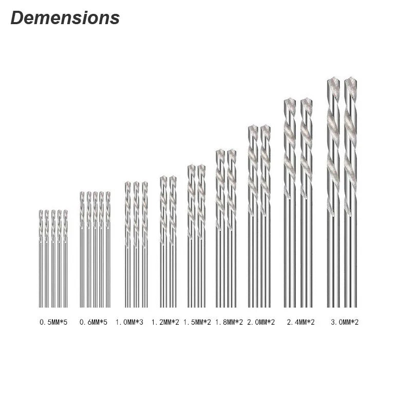 • Drill Bits Set: 9 different bits sizes: 0.5mm, 0.6mm, 1.0mm, 1.2mm, 1.5mm, 1.8mm, 2.0mm, 2.35mm, 3.0mm. Spiral chip space design for fast and clean chip removal. Tips: The drill bits are too tiny, so it is very fragile. Please be careful and take good control of the drilling speed.