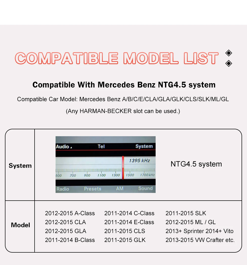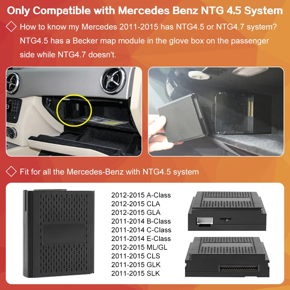 Compatible Car Model: Mercedes Benz A/B/C/E/CLA/GLA/GLK/CLS/ML/GL/GLK/SLK with NTG4.5 2011-2015 Year