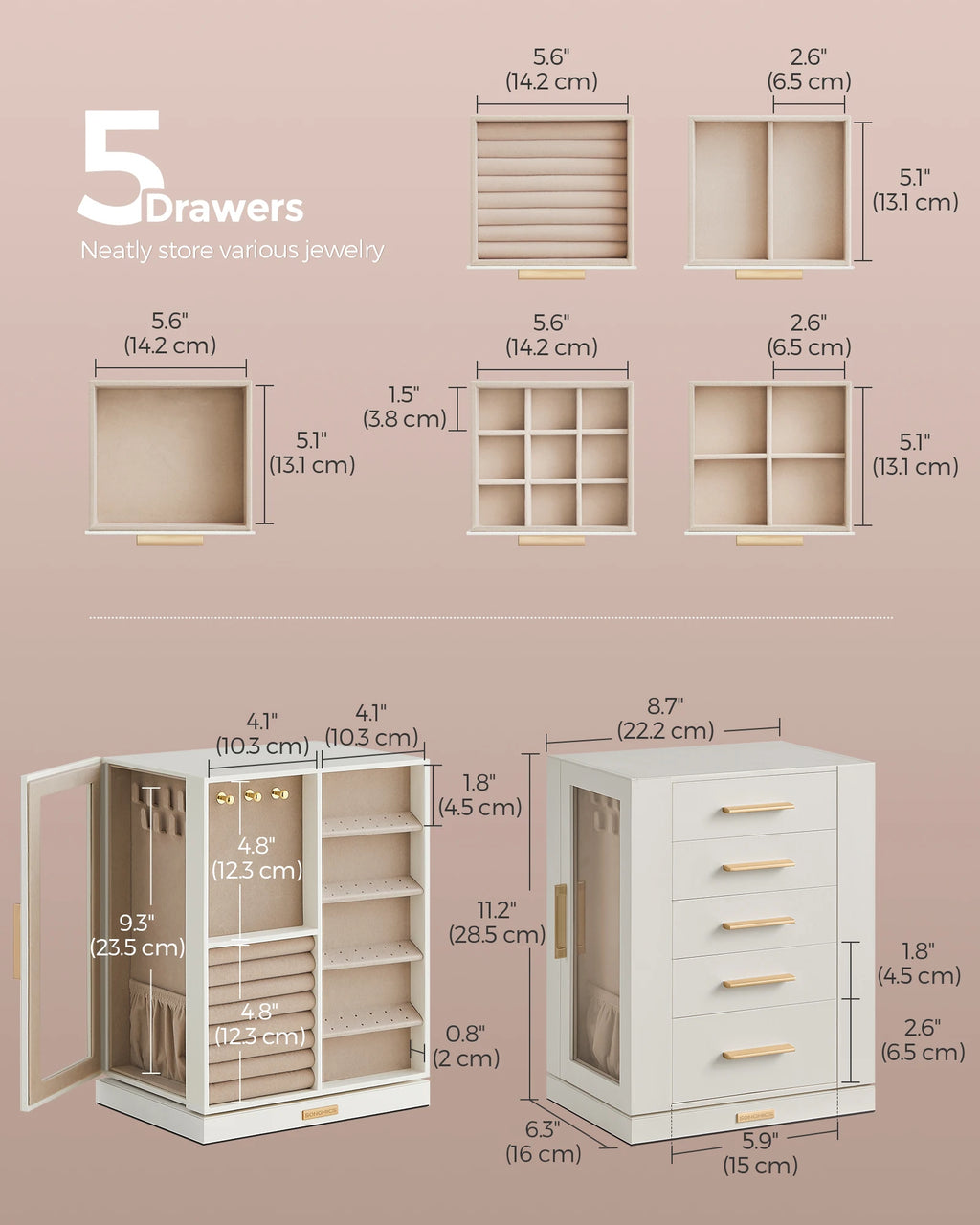 [Spacious Meets Versatile] This 6.3 x 8.7 x 11.2 inches jewelry box is designed with ring slots, necklace hooks, stud earring holes, 5 drawers for brooches and hair accessories, and 18 necklace hooks. It provides convenient storage for all jewelry