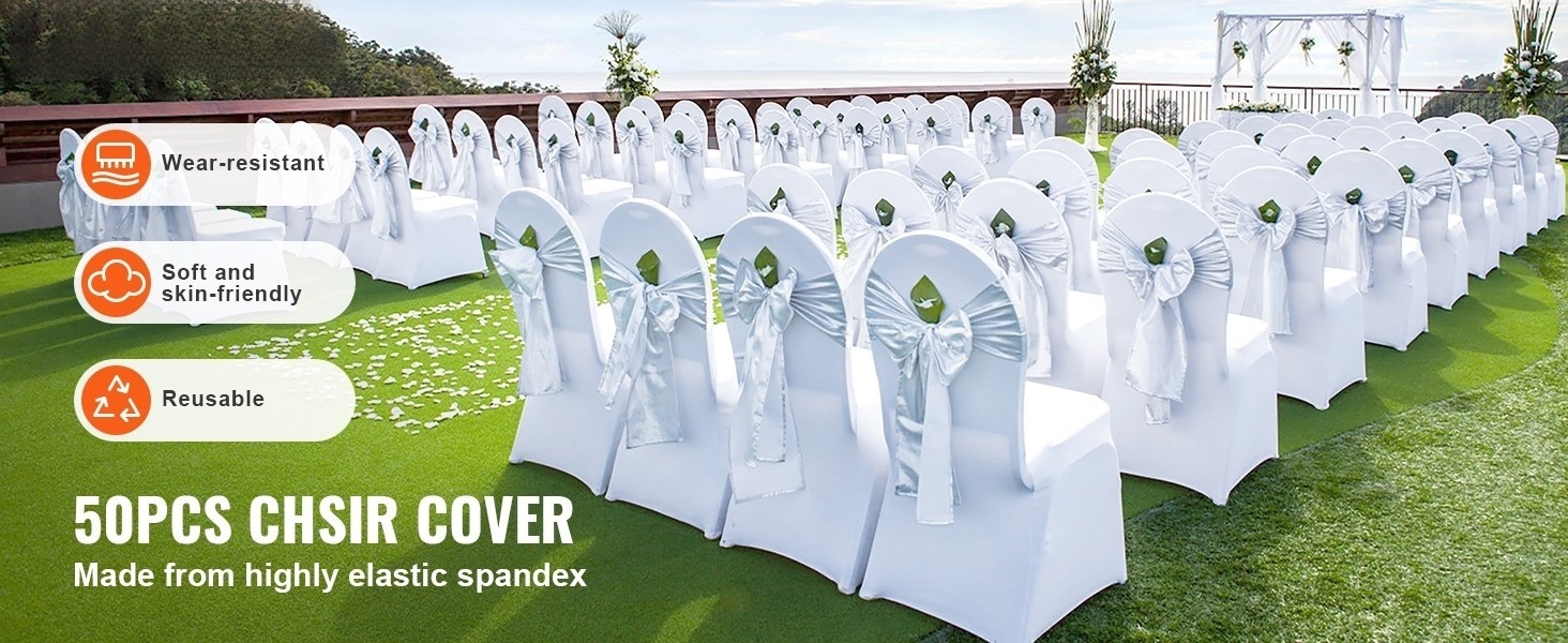 Premium Material: Each box contains 50 white chair covers made from 95% polyester and 5% spandex. The durable fabric and quality stitching ensure extra comfort and elasticity, protecting chairs from spills, pet scratches, stains, and tears. Ideal for indoor and outdoor events.
