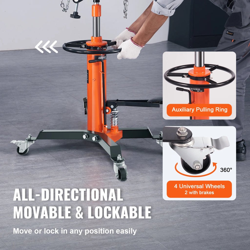 • Movable & Lockable: Our transmission jack is equipped with 4 wheels, two of which have brakes, making it easy to move around. The auxiliary ring in the middle enables you to push or pull the jack with ease. Lock the wheels in place to prevent unwanted sliding during use.