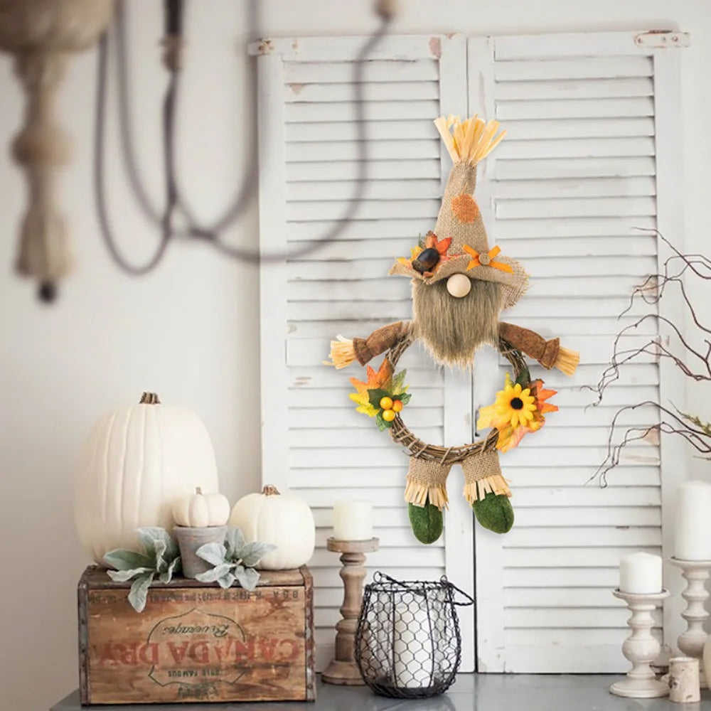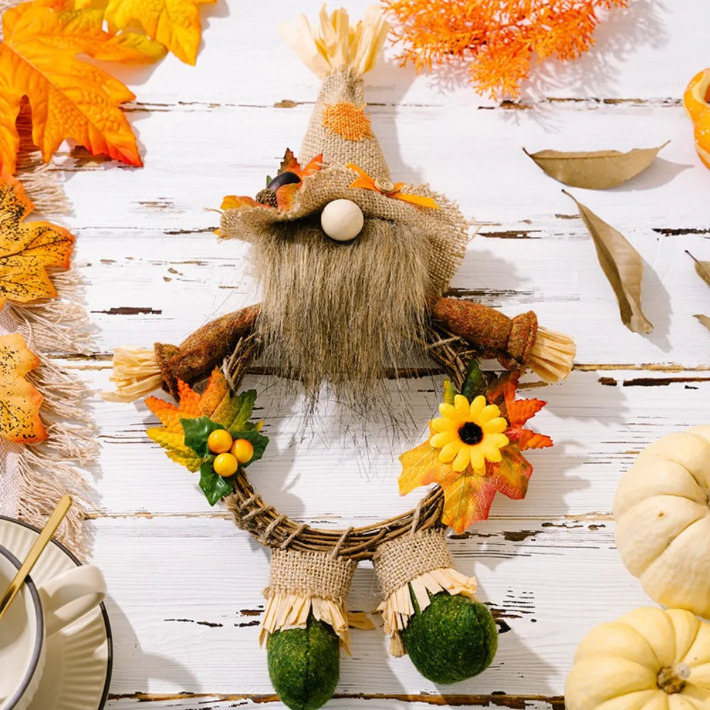 2.Fall harvest wreath rattan wreath with gnome: the wreath is decorated with flower, rattan and gnome decors, full of thanksgiving and fall breath.