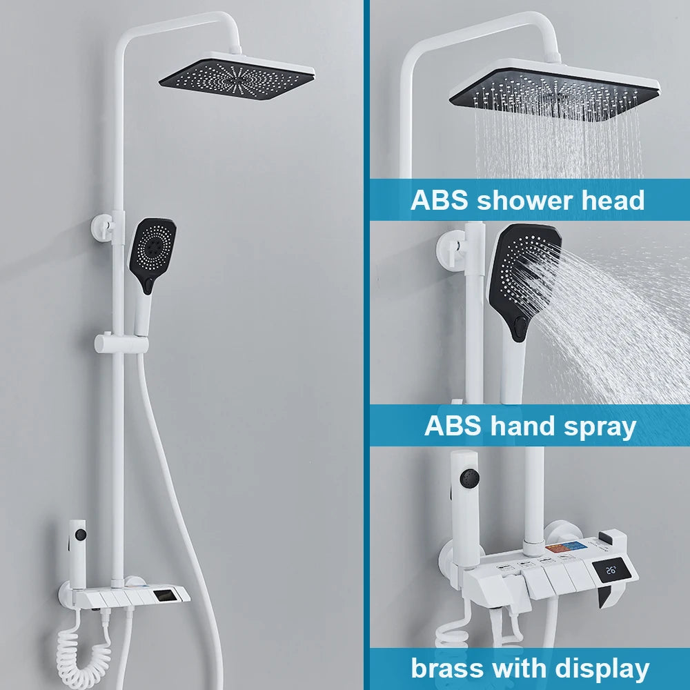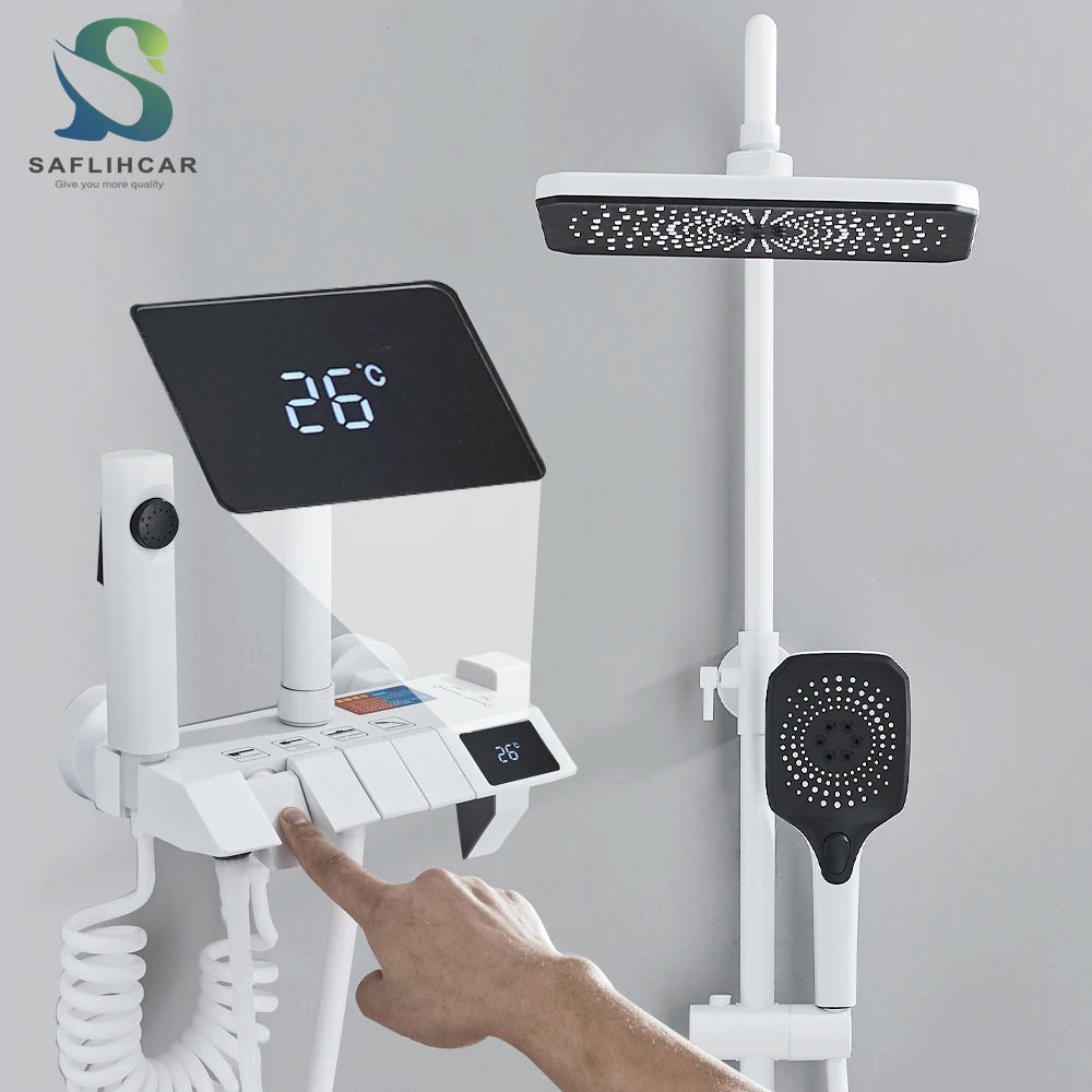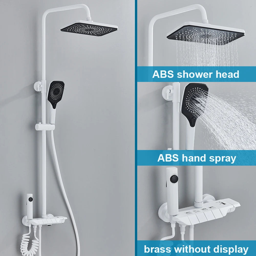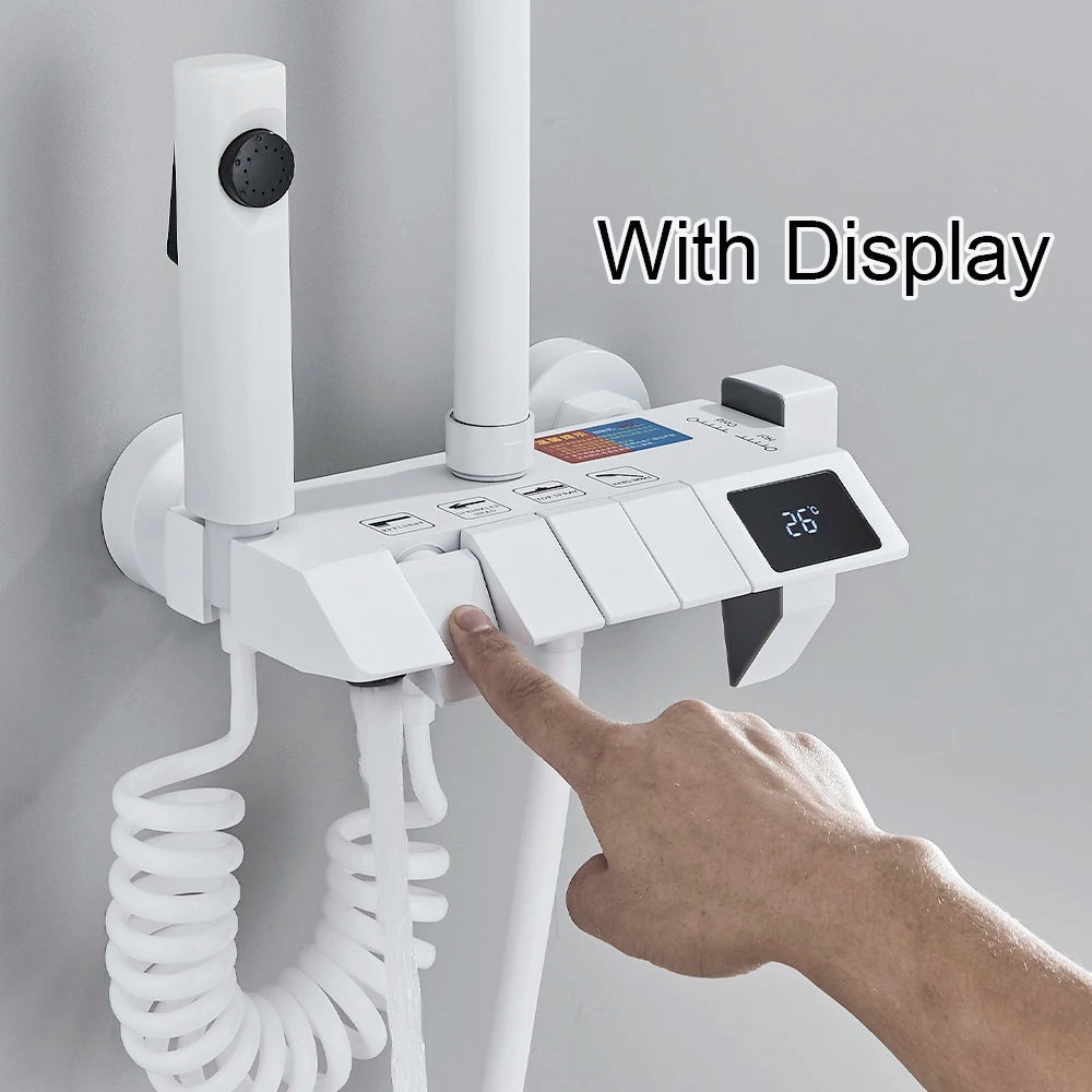 White Bathroom Shower Faucet with Digital Display 4 Function Wall Mount Hot Cold Water Tap Piano Bathroom Shower System