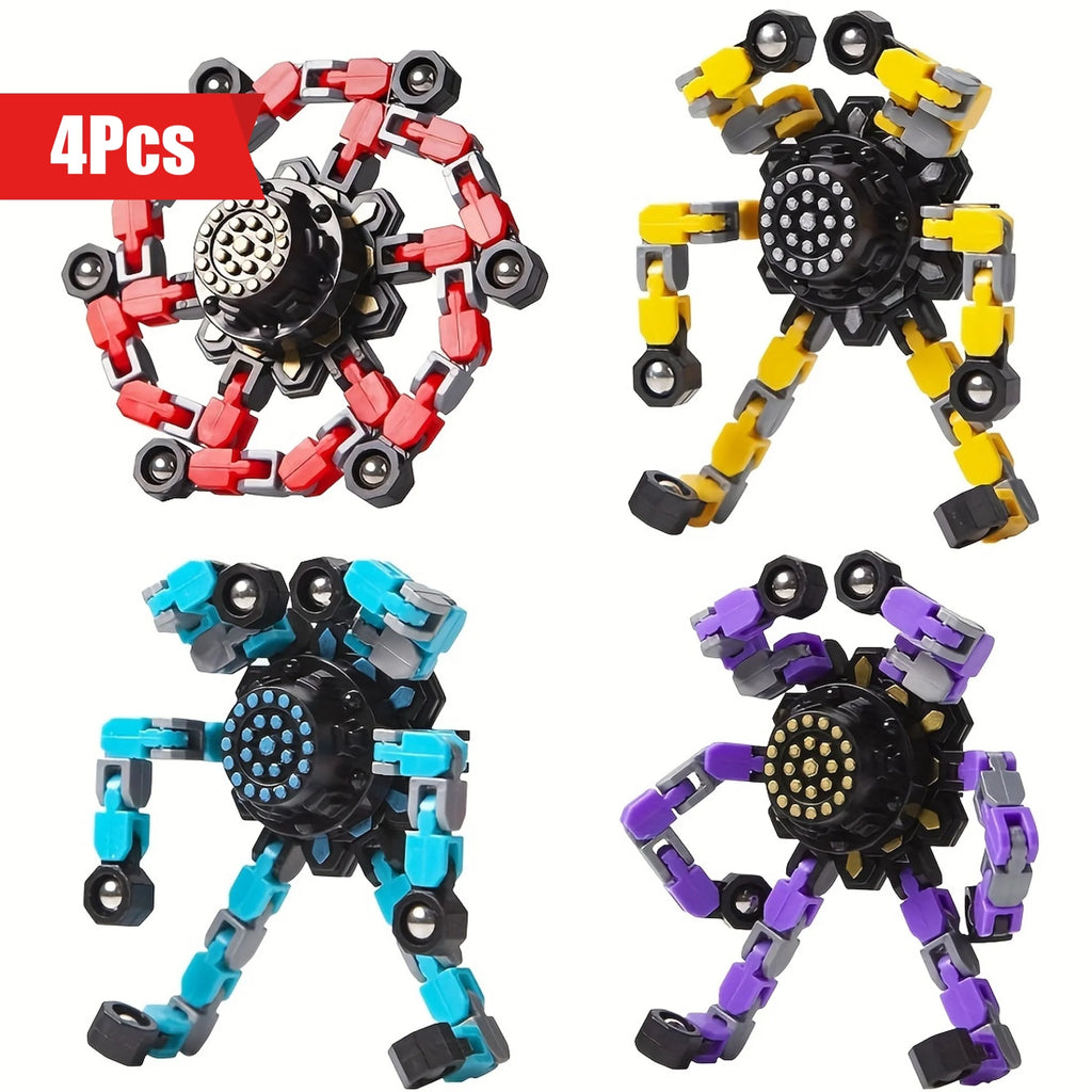 【Transformable Finger Gyros】4 colors (red yellow blue purple) finger spinners included. Each fidget spinner has six deformable chains. Each of the links can pivot and lock into 5 positions, you can create any shapes you want, such as various shapes of spinners, robots and even mobile phone holders. It can also exercise your kid’s hands-on ability, hand-eye coordination and logical thinking ability by changing the shape of the toys
