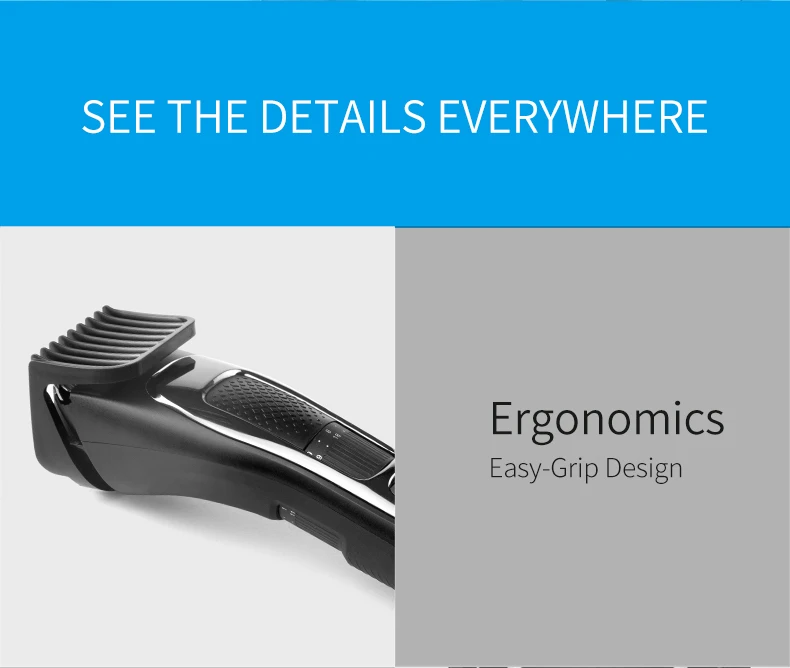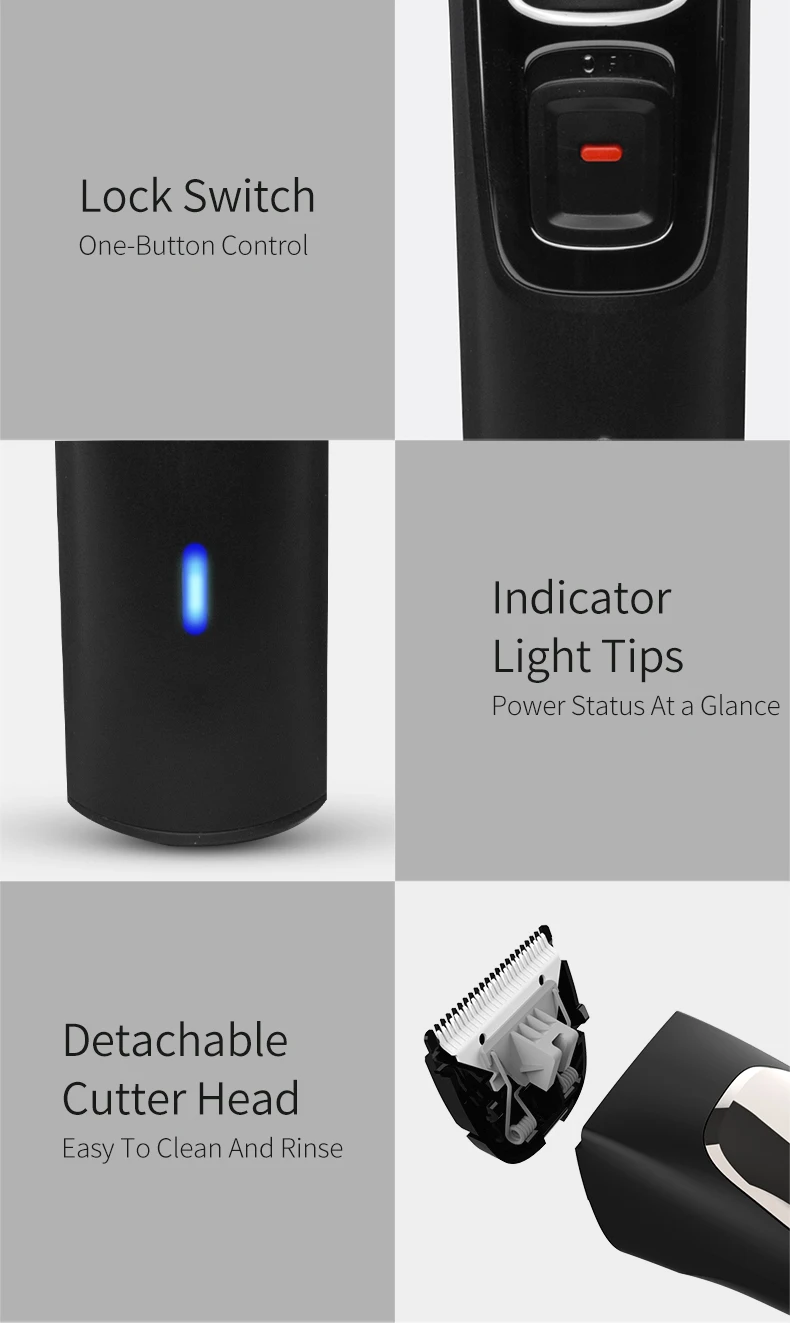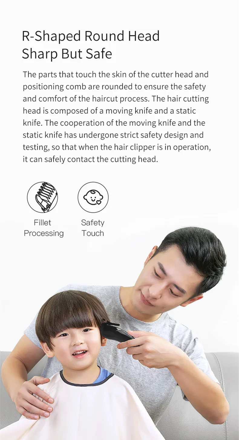Die Teile, die die Haut des Schneidkopfes und des Positionierungskamms berühren, sind abgerundet, um die Sicherheit und den Komfort des Haarschnittprozesses zu gewährleisten. Der Haarschneidekopf besteht aus einem beweglichen Messer und einem statischen Messer. Das Zusammenwirken des beweglichen Messers und des statischen Messers wurde strengen Sicherheitskonzepten und -tests unterzogen, damit der Haarschneider im Betrieb den Schneidkopf sicher berühren kann.
