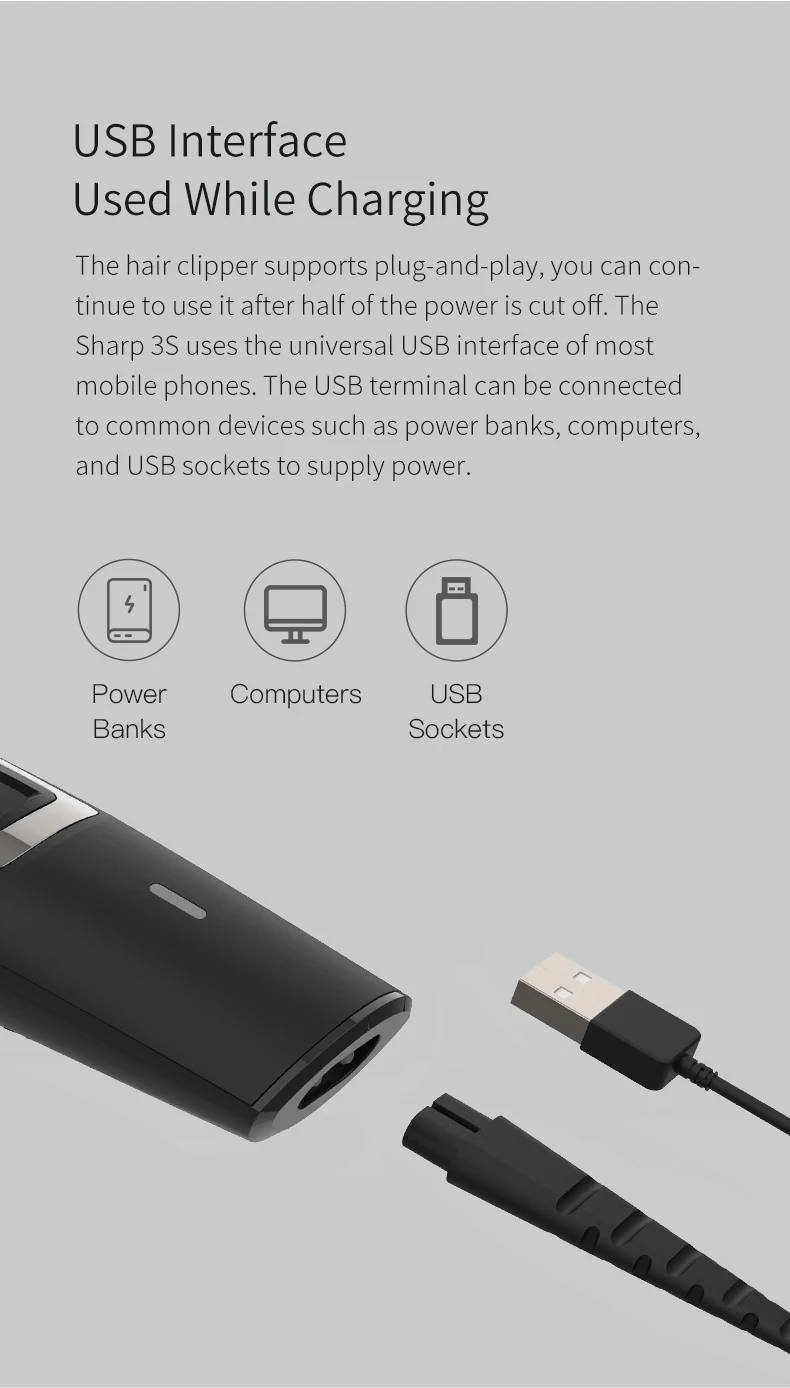 Der Haarschneider unterstützt Plug-and-Play, Sie können ihn weiter verwenden, nachdem die Hälfte der Stromversorgung unterbrochen wurde. Das Sharp 3S nutzt die universelle USB-Schnittstelle der meisten Mobiltelefone. Der USB-Anschluss kann an gängige Geräte wie Powerbanks, Computer und USB-Steckdosen zur Stromversorgung angeschlossen werden.