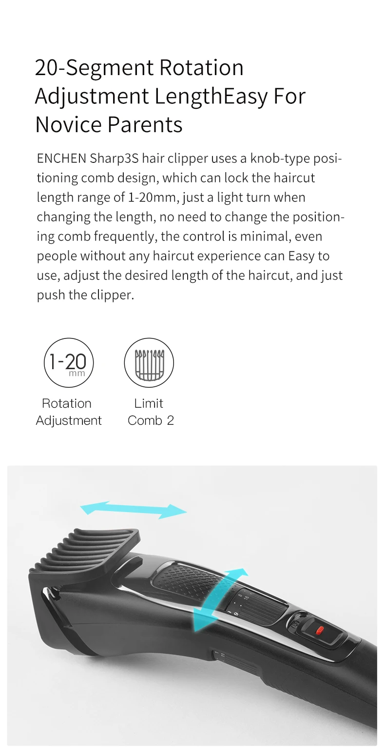 Der ENCHEN Sharp3S Haarschneider verwendet ein knopfartiges Positionierungskammdesign, das den Haarschnittlängenbereich von 1-20 mm sperren kann, nur eine leichte Drehung beim Ändern der Länge, kein häufiges Wechseln des Positionierungskamms erforderlich, die Kontrolle ist minimal, sogar Menschen Ohne jegliche Haarschnitt-Erfahrung können Sie die Haarschneidemaschine einfach bedienen, die gewünschte Länge des Haarschnitts einstellen und einfach drücken.