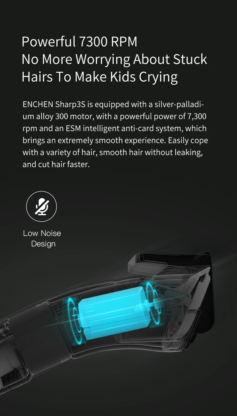 ENCHEN Sharp3S ist mit einem 300-Motor aus Silber-Palladium-Legierung mit einer starken Leistung von 7.300 U / min und einem intelligenten ESM-Anti-Karten-System ausgestattet, das ein extrem reibungsloses Erlebnis bietet. Bewältigen Sie problemlos eine Vielzahl von Haaren, glätten Sie das Haar, ohne auszulaufen, und schneiden Sie das Haar schneller.