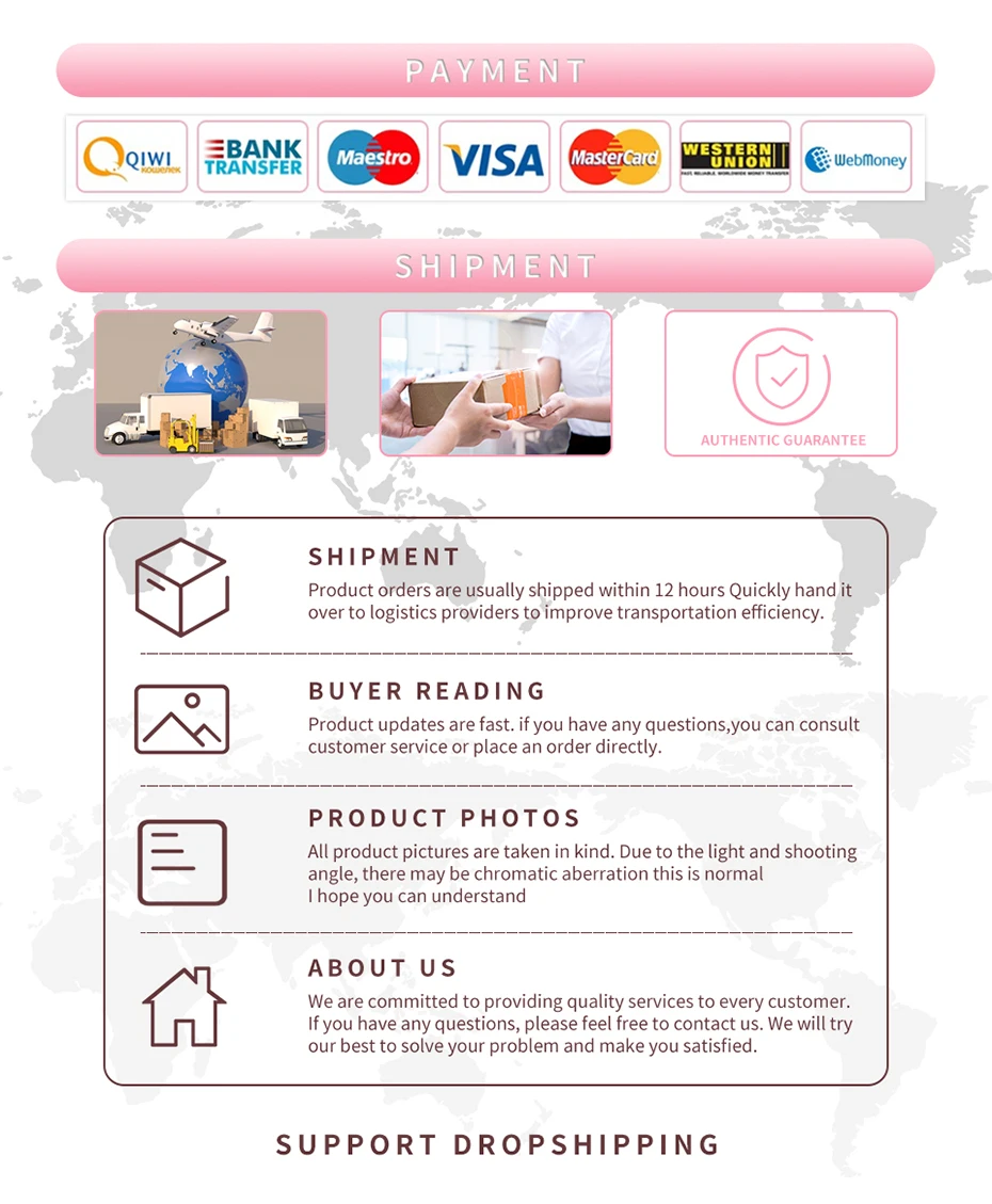 Willkommen Dropshipping & Großhandelsbestellungen 1. Dropshipping: Versand innerhalb von 24 Stunden, keine Rechnung oder Werbeinformationen, gültiger Tracking-Code, schnelle Lieferung.