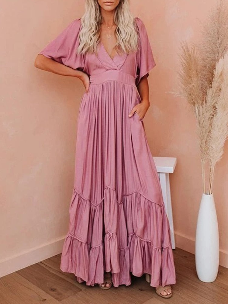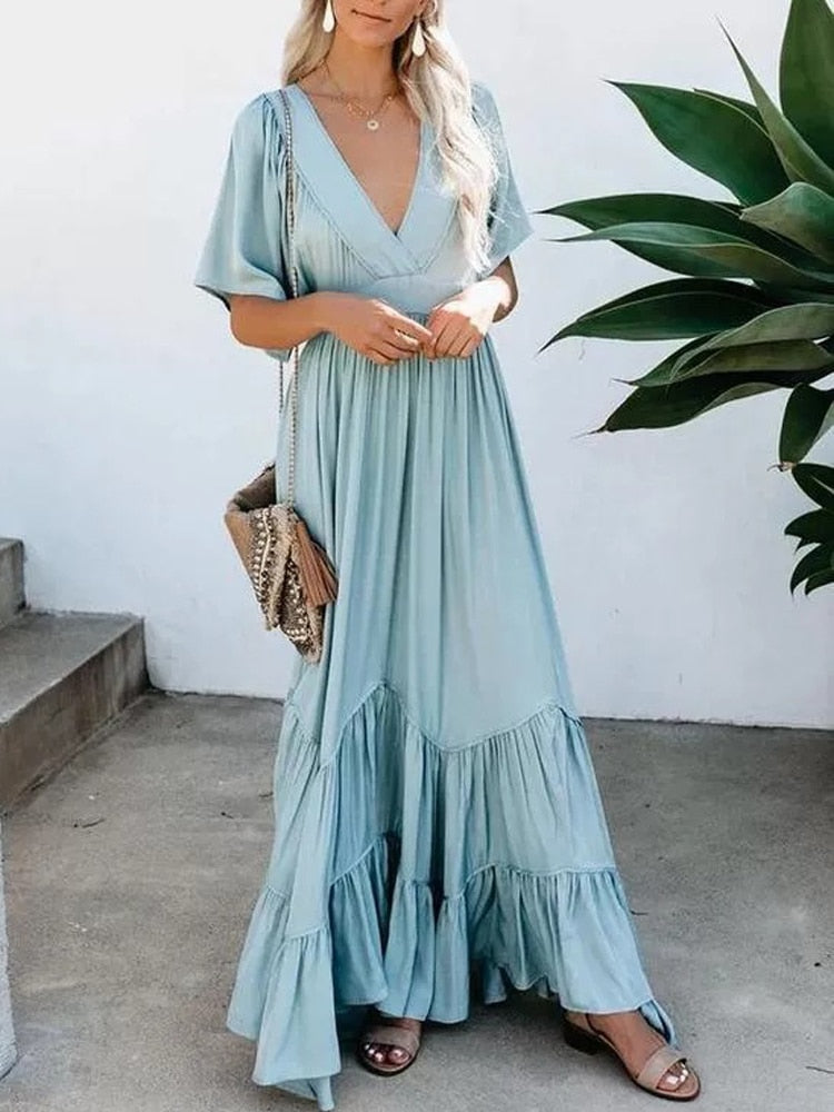 Flounced Edge Maxi Dresses for Women 2022 Maternity Short Sleeve V Neck Sexy Beach Wear Loose Fit Solid Summer Dress High Waist