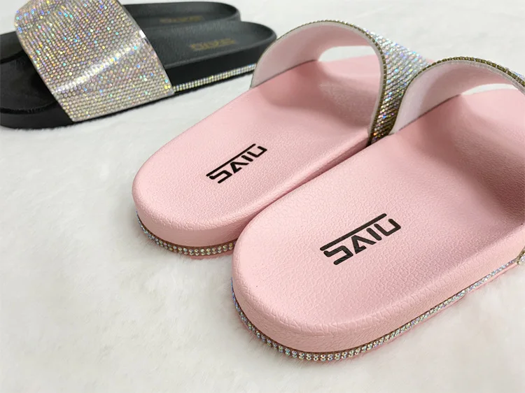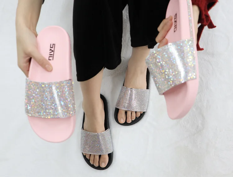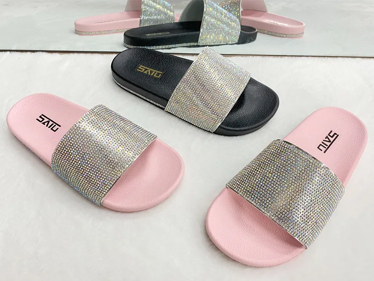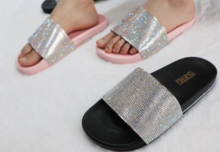 Leisure New Black Rhinestone Slippers Women's Summer Outdoor Crystal PVC Soled Slides Ladies Sexy Cool Comfort Beach Sandals