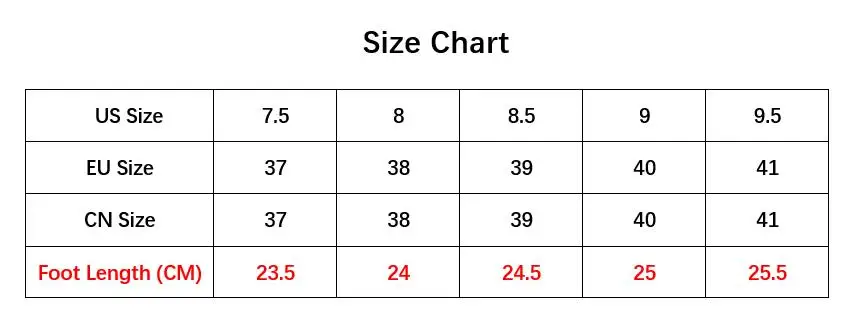 Note: We sent shoes marked in CN size or Shoes length. Please measure your FOOT LENGTH first and choose the correct US size. For example: My foot length is 24cm, please choose US size 8 = CN size 38 = Foot Length 24cm.