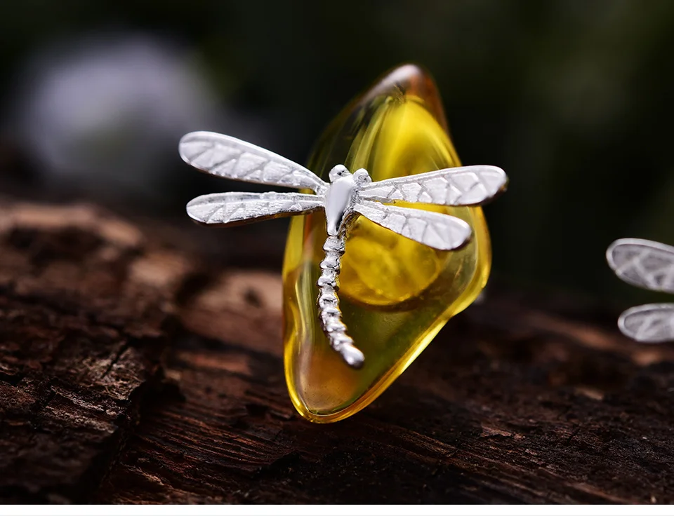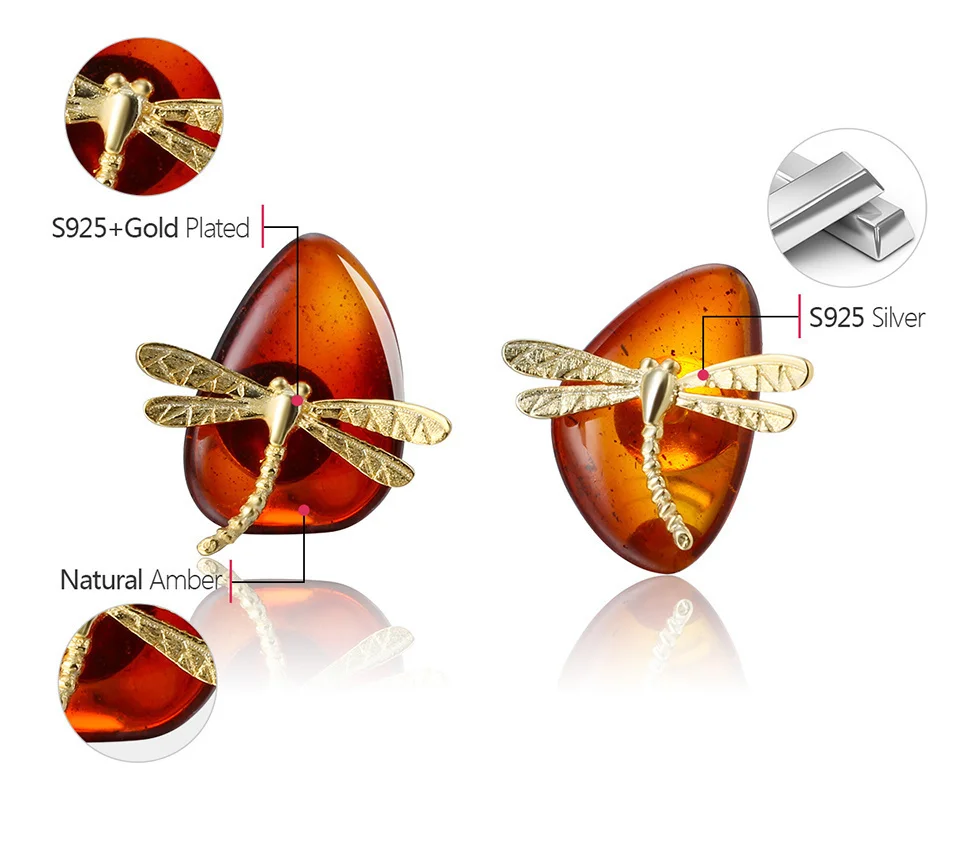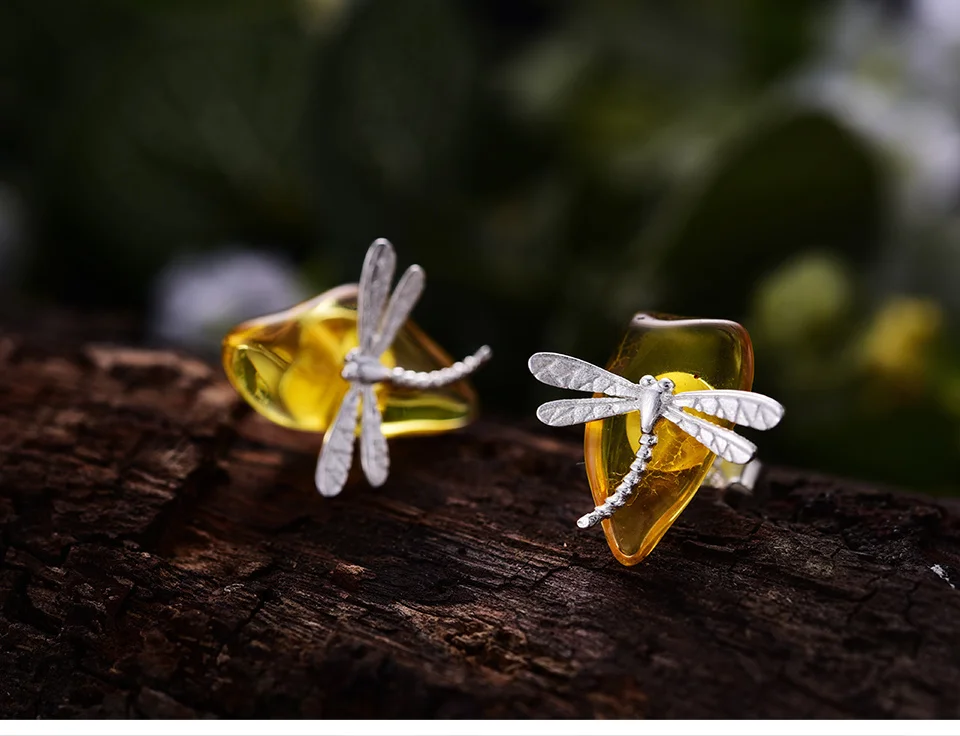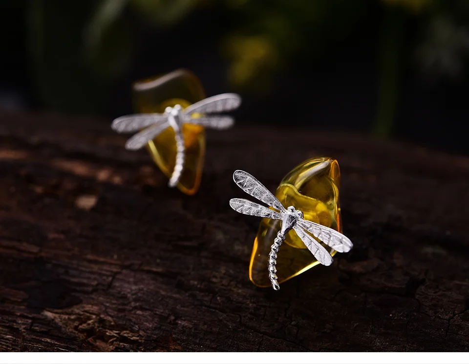 Lotus Fun Real 925 Sterling Silver Natural Amber Handmade Fine Jewelry 18K Gold Cute Dragonfly Stud Earrings for Women Brincos