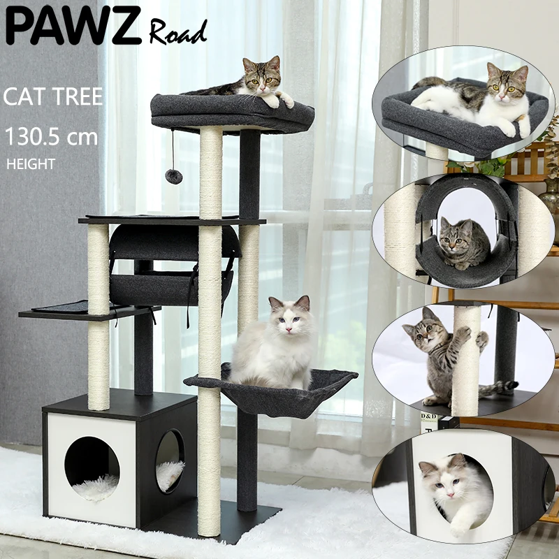 1. Stilvolles und neuartiges strukturelles Design, moderner Katzentisch ist mit Katzenhängematte, Nest, Schlafmatte und hängendem Ball ausgestattet. Die luxuriöse Größe bietet Platz für mehrere Kätzchen, die gleichzeitig Spaß haben, und sie können sich beim Spielen ausruhen, was ein perfektes Erlebnis bietet.