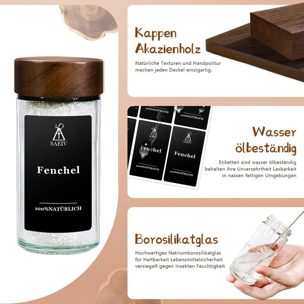 Aus hochwertigem Edelstahl und Natriumborosilikatglas, um Haltbarkeit und Lebensmittelsicherheit zu gewährleisten, luftdicht zum Schutz vor Insekten und Feuchtigkeit und um die Gewürze lange frisch und duftend zu halten