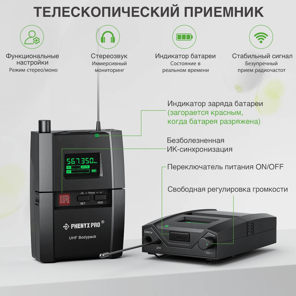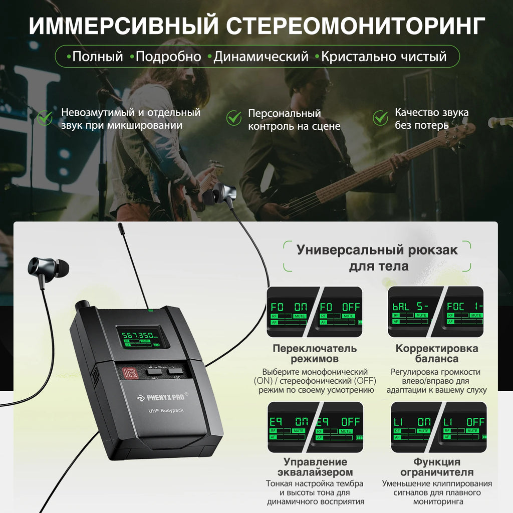 This UHF stereo wireless in ear monitor system operates in 500Mhz band (530Mhz-580MHz), free of interference by utilizing UHF wide audio signal transmission (Up to 6 systems can operate simultaneously).