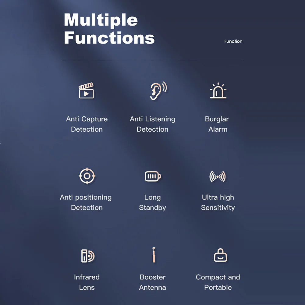 2. Advanced Anti-surveillance Technology: This bug detectors features an advanced AI intelligent chip that expands the detection range from 1MHz to 6.5GHz and enhances the product's anti-interference ability. With this powerful Anti-surveillance technology, you can easily discover cameras or anomalies in your surroundings.
