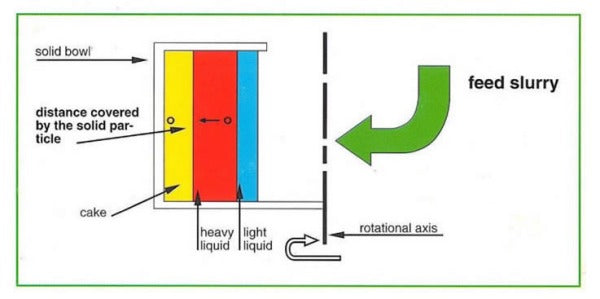 Im Zentrifugalfeld werden unter Einwirkung der Zentrifugalkraft die dichteren Feststoffe, wenn sie den Zentrifugalkräften ausgesetzt werden, nach außen gegen die rotierende Trommelwand gedrückt, während die weniger dichten flüssigen Phasen konzentrische innere Schichten bilden