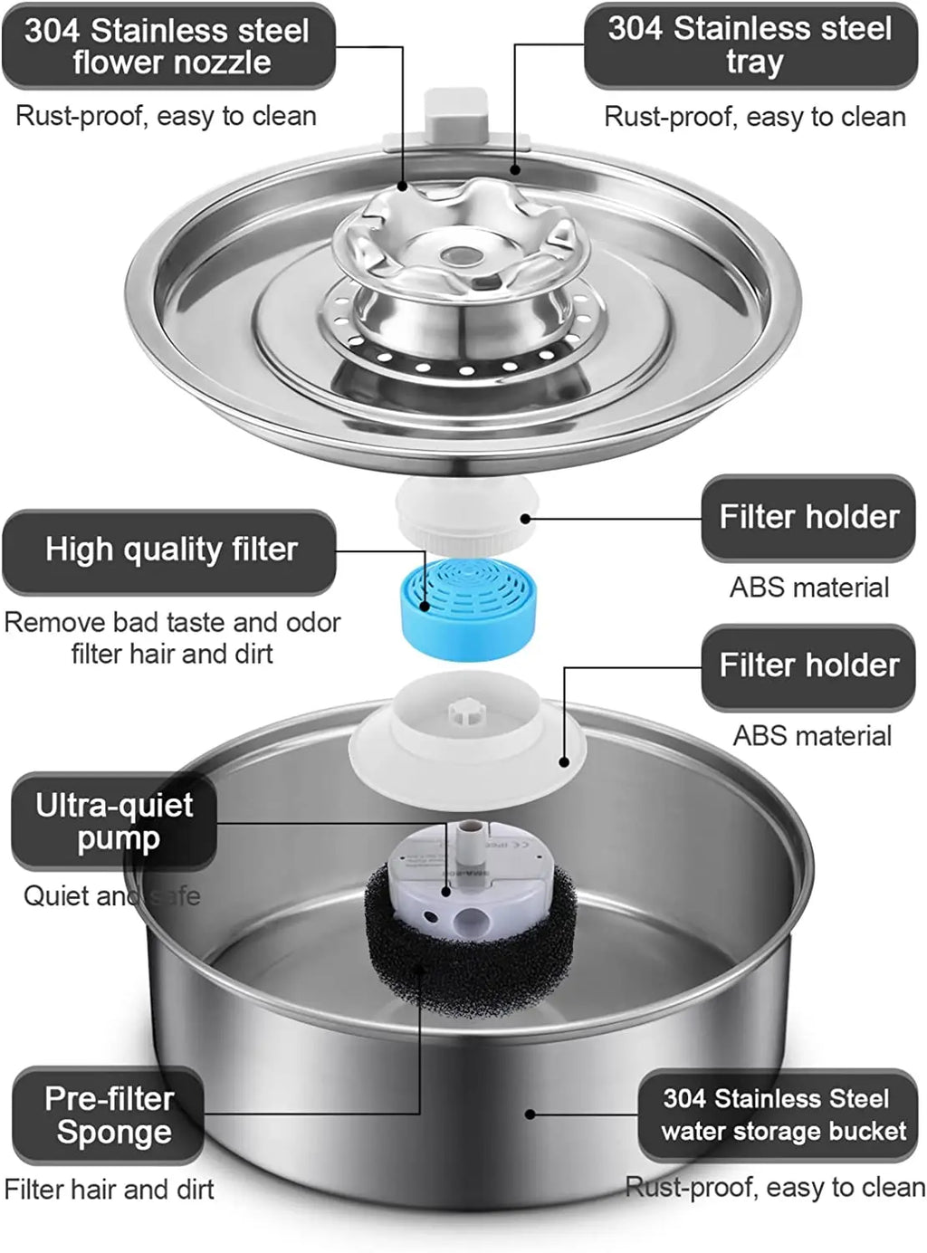 ◆[High-Quality Materials]The cat fountain is made of 304 stainless steel, strong, durable, easy to use and easy to clean.Stainless steel tray and water storage bucket are dishwasher safe.