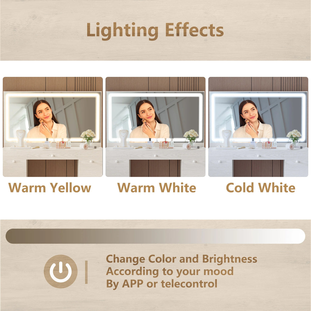 This vanity desk dressing table comes with a large LED light mirror - the lighted mirror has 3 modes: warm color, natural color, and cold color. Long press the screen. The brightness can be adjusted according to different scenes and makeup needs.