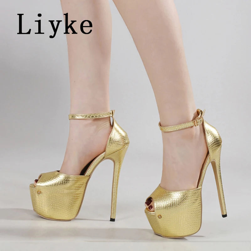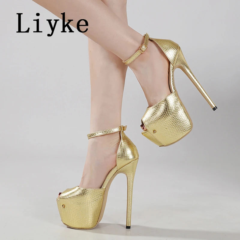 Liyke Elegant Women Wedding Party Prom Shoes Sexy Gold Snake Print Leather Peep Toe Platform High Heels Pumps Sandals Size 35-42