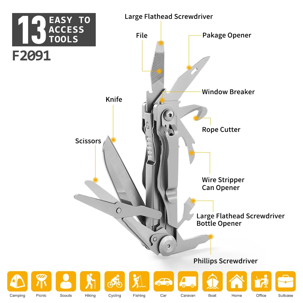 Feature: Knife,Scissors,File,Large Flathead screwdriver,Pakage Opener,Window Breaker,Rope Cutter,Wire Stripper Can Opener,Large Flathead ScrewdriverBottle Opener,Phillips Screwdriver