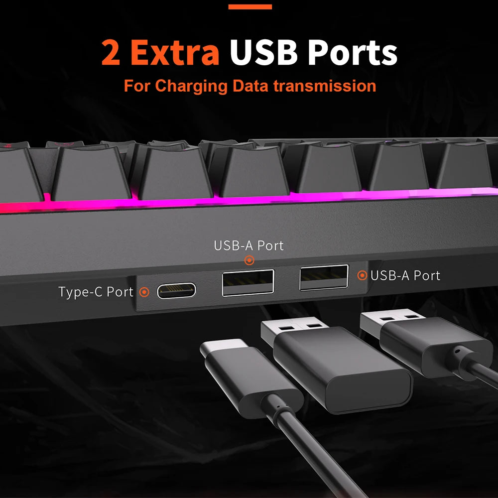 7.Hub Design - This wireless mechanical keyboard is armed with 2 built-in USB pass-through ports and 1 Type-C Portallowing to back up more facilities