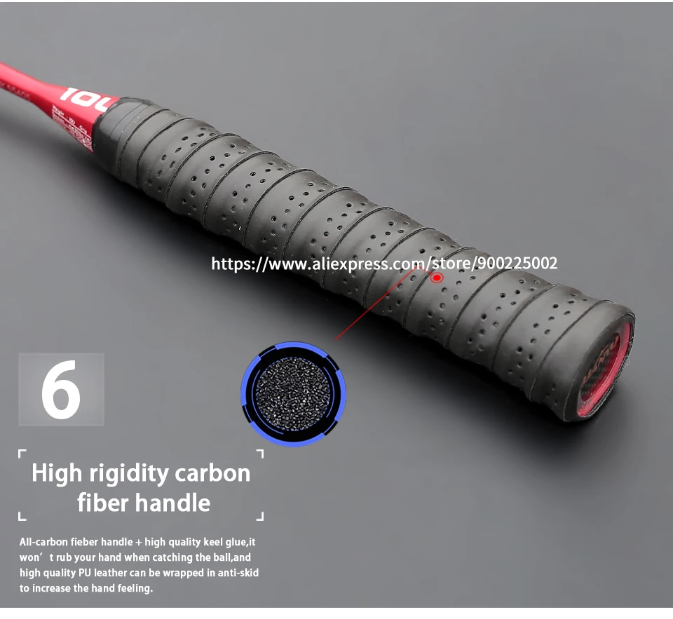 FIBRA DE CARBONO: la raqueta es más liviana pero más fuerte, por lo que la tensión puede llegar hasta 30LBS, adecuada para jugadores principiantes y profesionales;