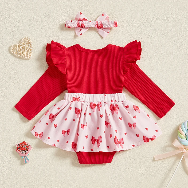 Baby Girls Valentine Romper Dress Bow/Flower Print Ruffles Long Sleeve Jumpsuits and Cute Headband Set