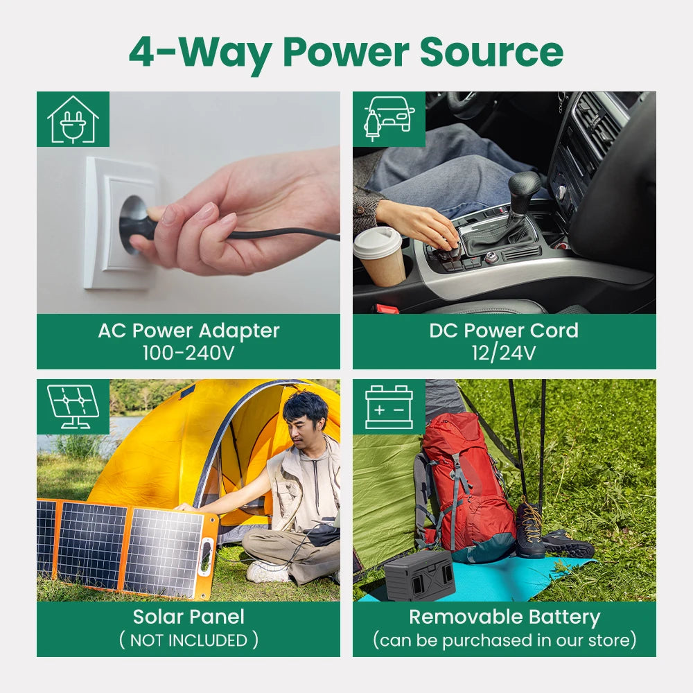 Providing three levels of battery voltage protection (H/M/L), it can prevent the car fridge draining the battery of your vehicle. The system responds to different startup and shutdown voltages, automatically stopping operation when it detects low battery voltage. This portable freezer can be powered in four ways: 110/240V AC, 12V/24V DC, 173Wh detachable battery or through solar panels connected to a portable power station, ensuring charging options even during outdoor camping. Note: Detachable batteries require separate purchase.