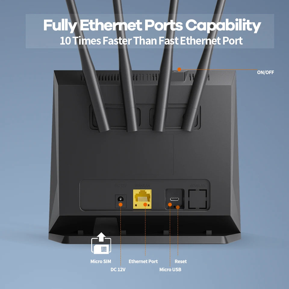With a SIM card slot and RJ45 ports, say goodbye to the trouble of no net available, plug in the card and have net anytime and anywhere.