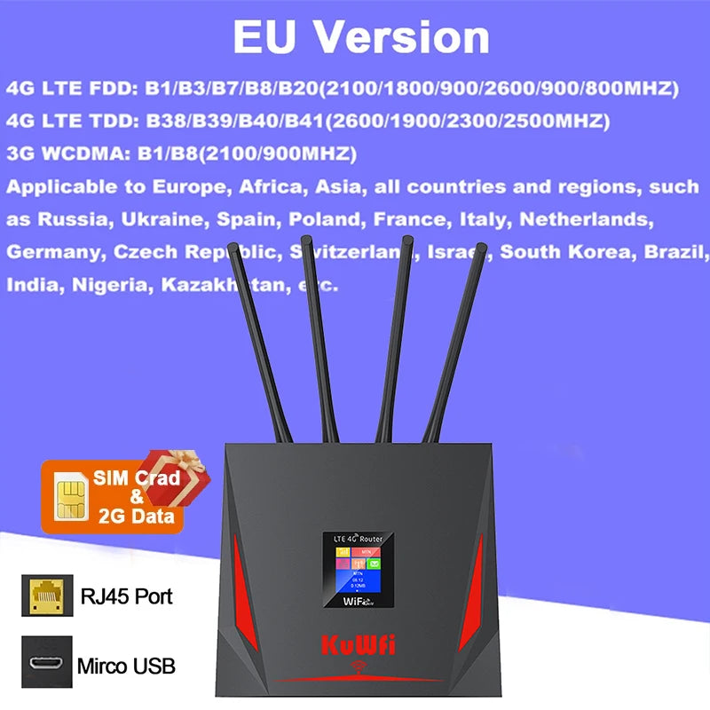 KuWfi 4G LTE Router CAT4 300Mbps Wifi Router 4G Modem with Free SIM Card RJ45 WAN LAN External Antenna Support 10 Users Connect