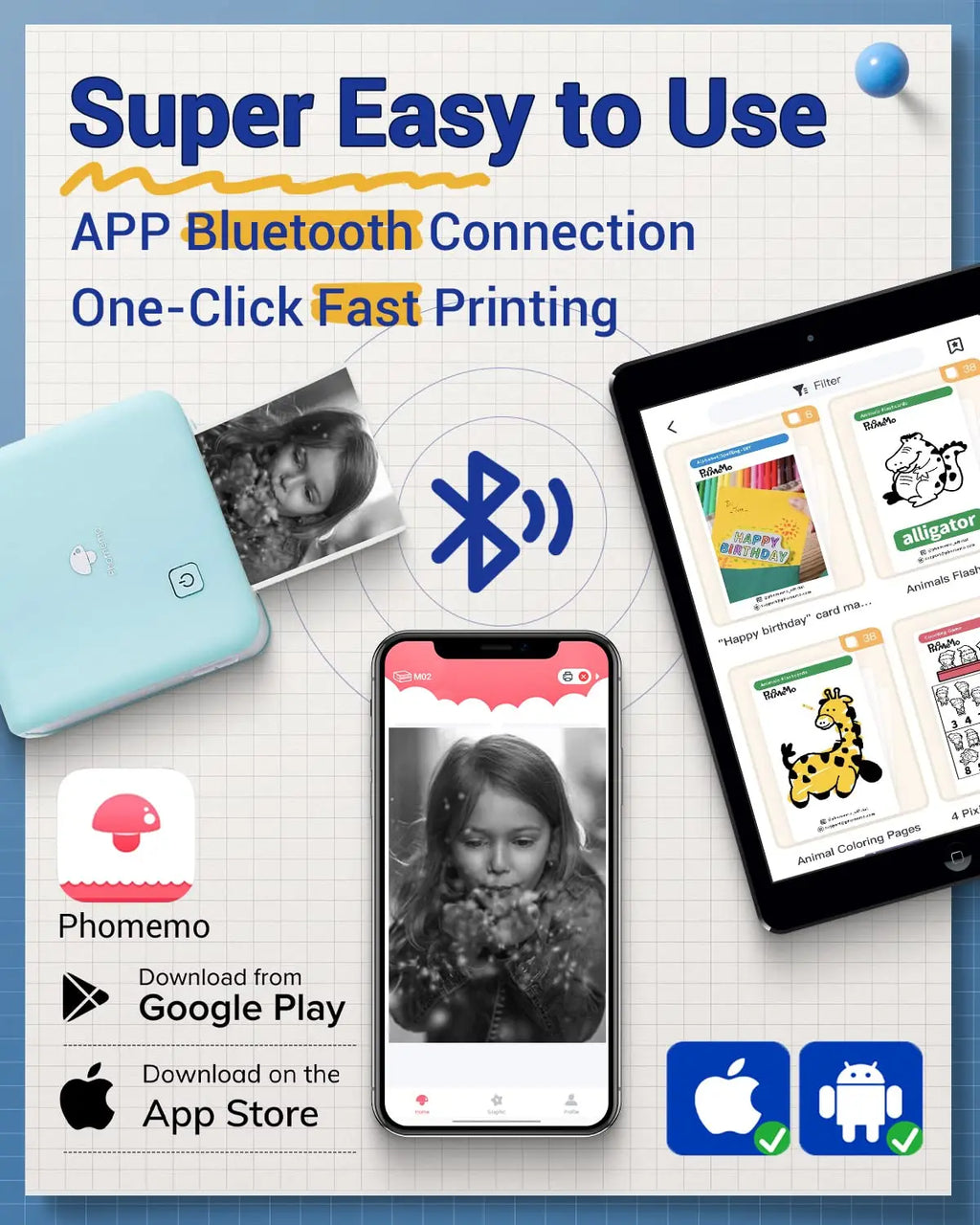 Bluetooth Connection with iOS & AndroidiOS & Android printer is connected easily with the smartphone or iPad via Bluetooth 4.2. System for iOS 9.0 & Android 8.0. And Type-C charging port help ypu save time, it only take half of the time to be fully charged compared with others.