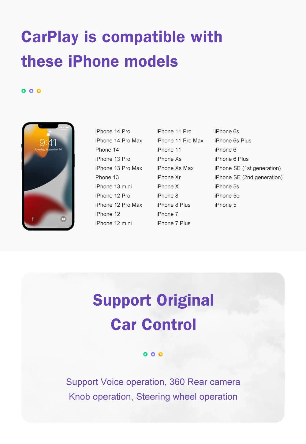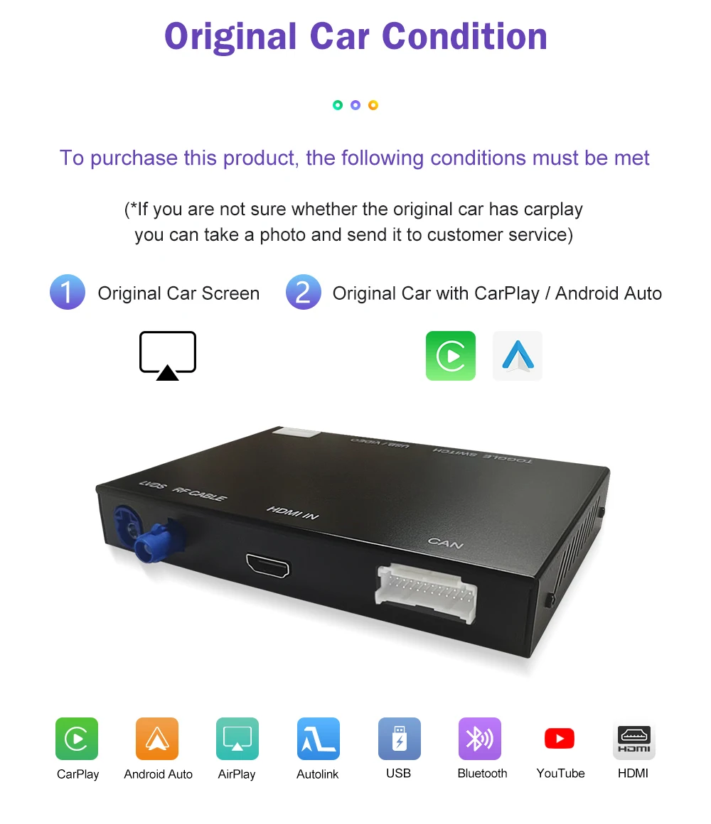 1.This amazing kit adds full CarPlay functionality to your existing head unit while retaining all the original head unit features.The CarPlay system supports button and steering wheel control and is integrated with the console or glove box USB.