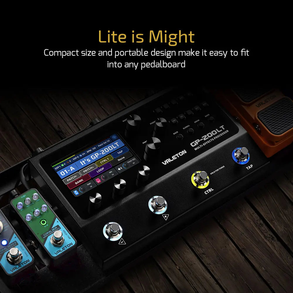 Based on GP-200's technology, Valeton now delivers this predecessor's Lite version -- GP-200LT. With 4 footswitches, enormous I/O options, large color-display screen and user-friendly buttons and knobs, GP-200LT will fit into any scenario to become your go-to gear.