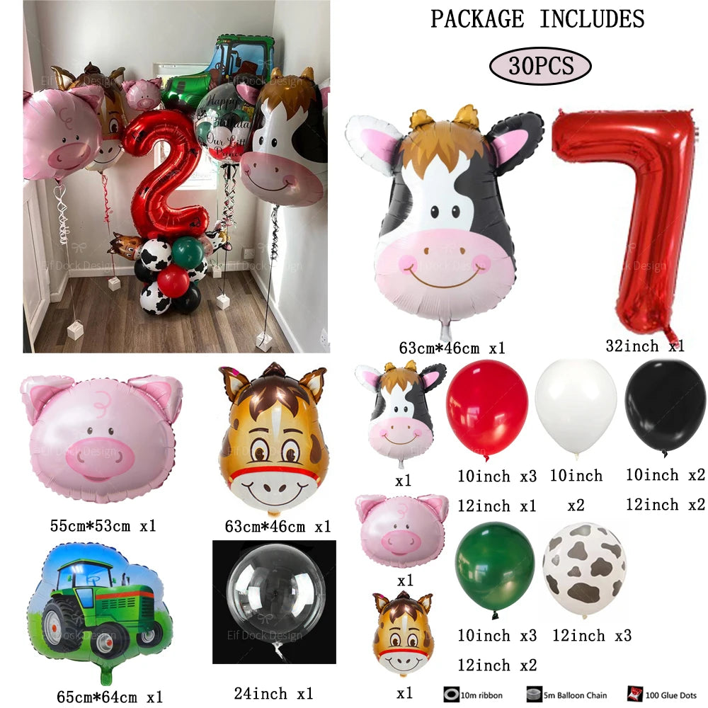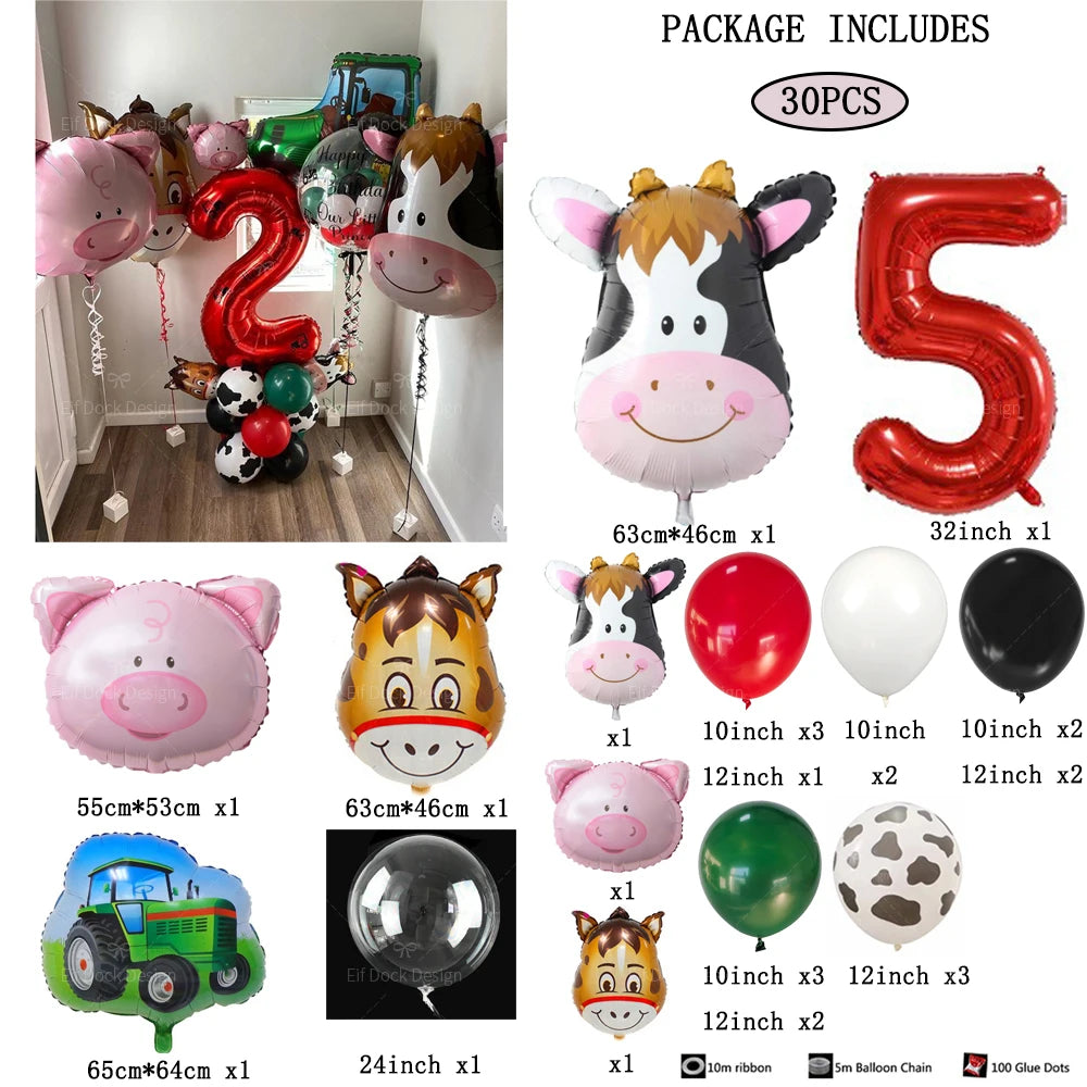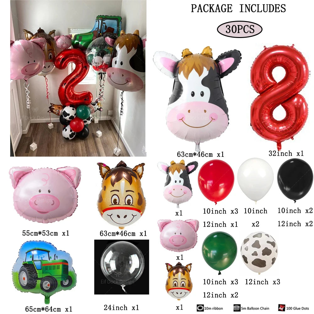 30pcs Farm Theme Green Tractor Cow Pig Inflatable Balloons 32inch Red 1-9 Number Balloon Happy Birthday Party Decor Baby Shower