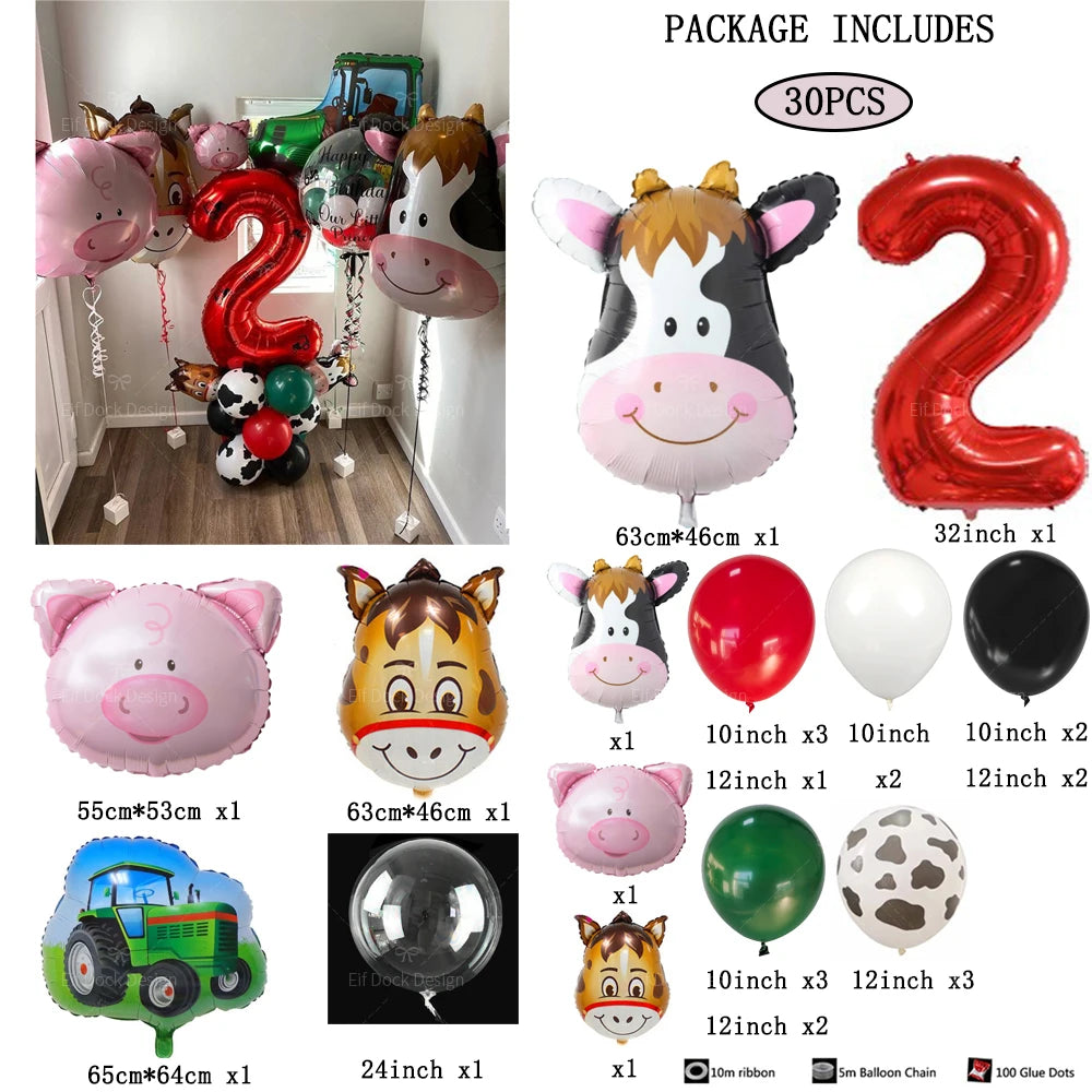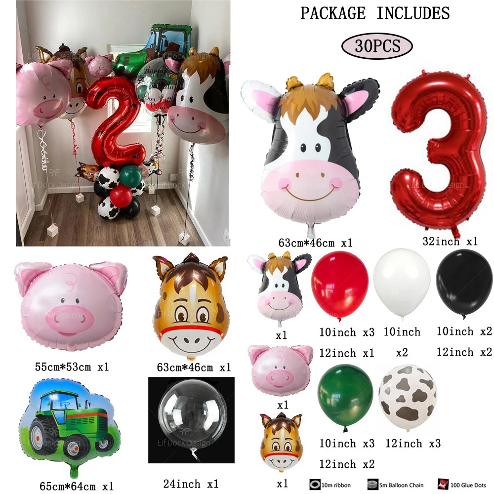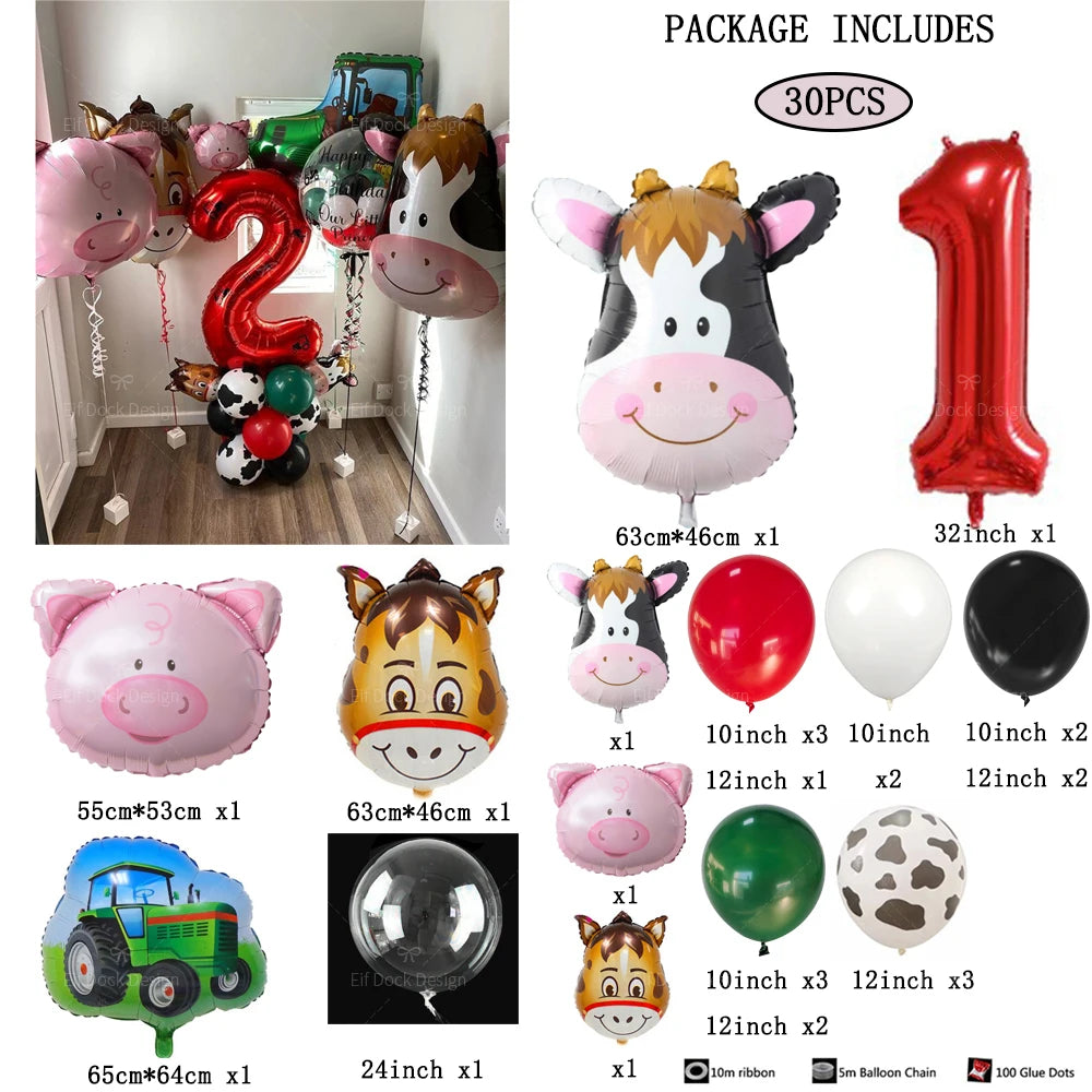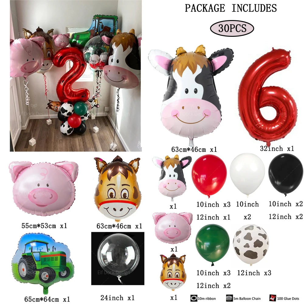 30pcs Farm Theme Green Tractor Cow Pig Inflatable Balloons 32inch Red 1-9 Number Balloon Happy Birthday Party Decor Baby Shower