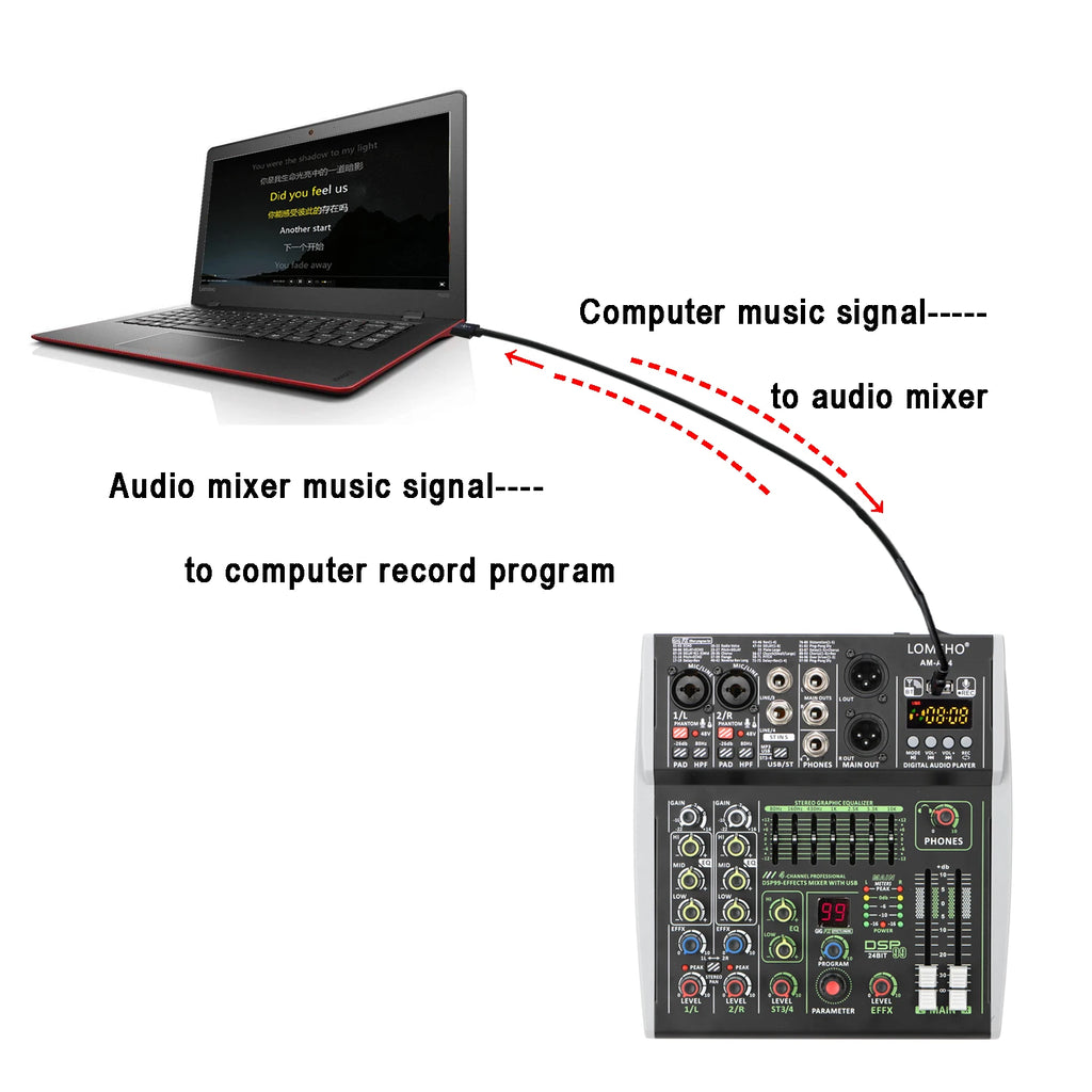 Buyer downloads music play software, and choose mixer as speaker. Then computer music signal will come into mixer.