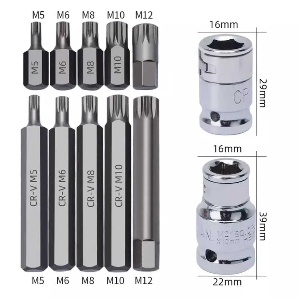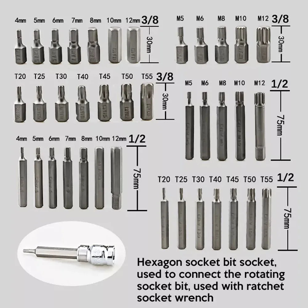 This set Includes 2 x chrome vanadium 3/8" and 1/2" drive sockets.