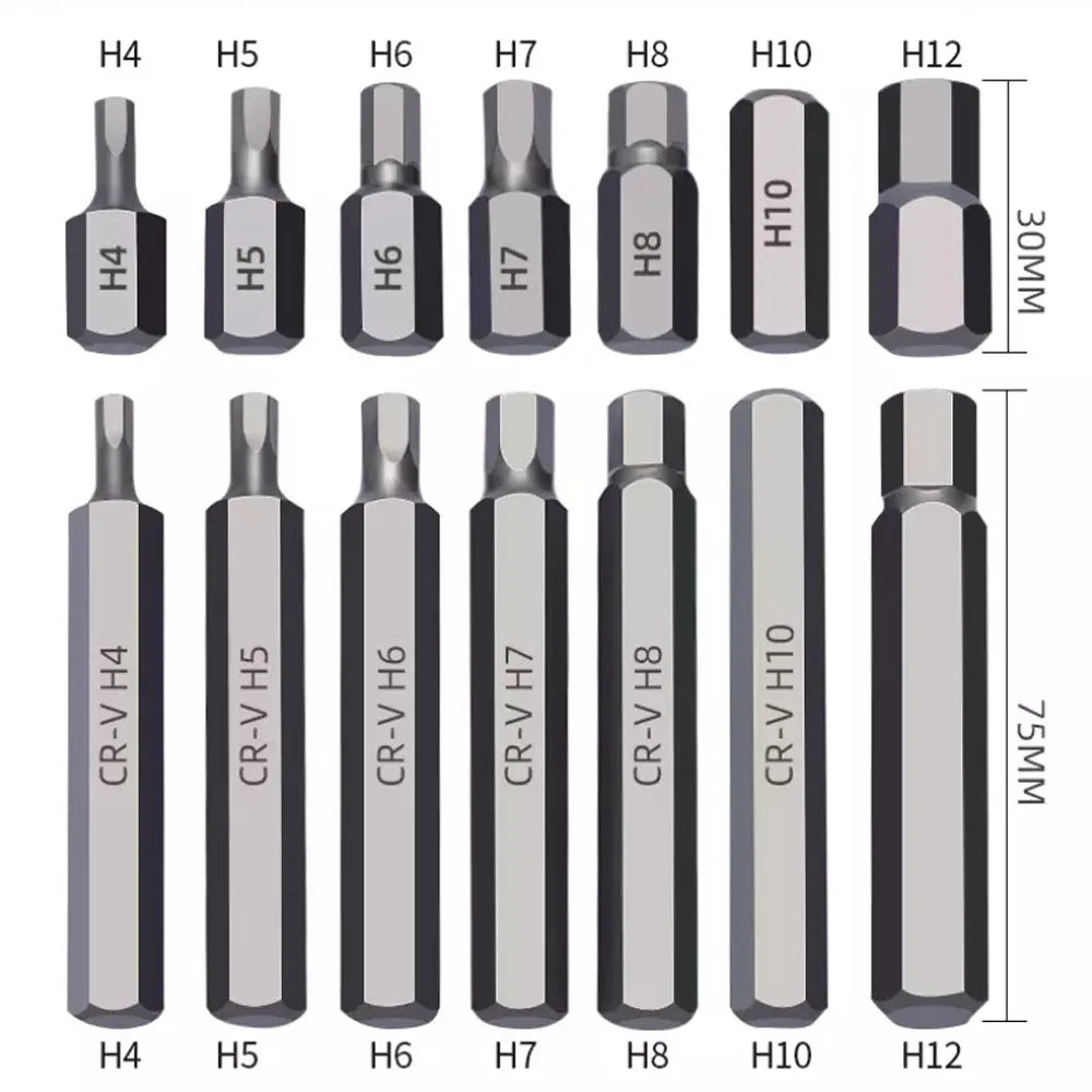 All of the bits, with the exception of a few of the larger bits, share the same 12mm diameter hex base, which allows faster bit changes.