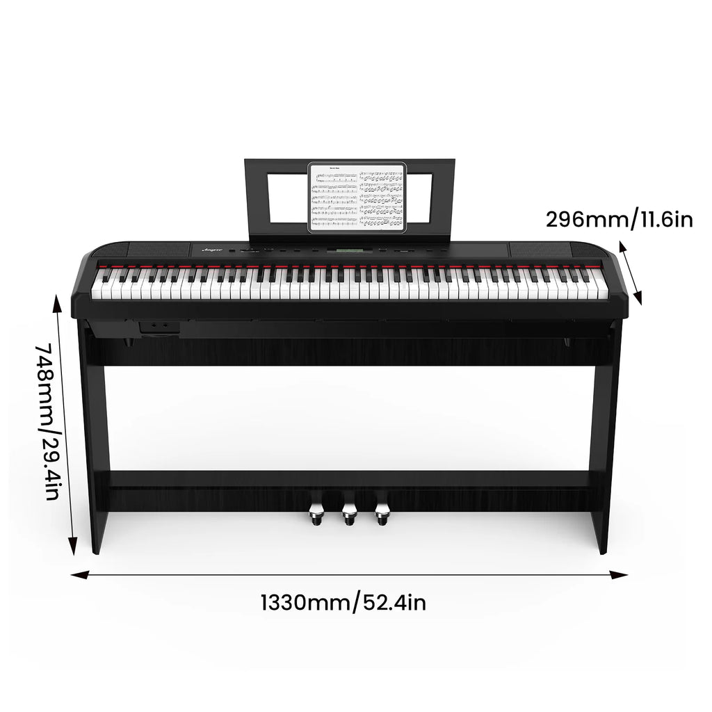🎹【PORTABLE & EASY TO CARRY】The electronic piano dimensions is 52.4" (L) x 11.6" (W) x 29.4" (H), net weight: 46.5 lbs. Convenient to carry, you can play anytime, anywhere. Such as birthday parties, concerts, family gatherings, etc. Make the atmosphere happier through beautiful piano music.