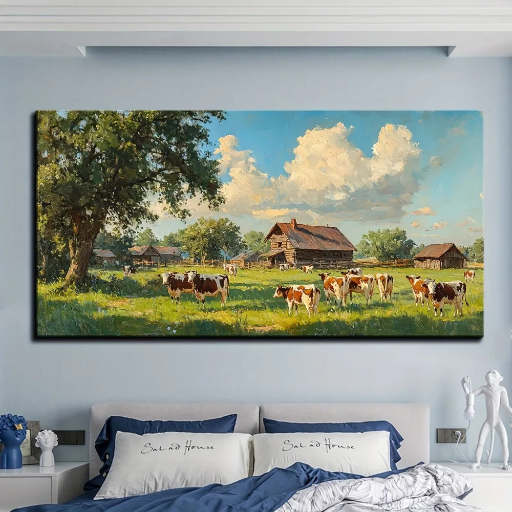 Charming vintage farmhouse canvas painting - gold frame, with cattle and old barns, 1.5 inch thick pine solid wood frame